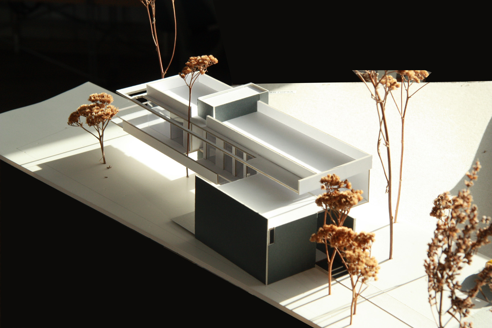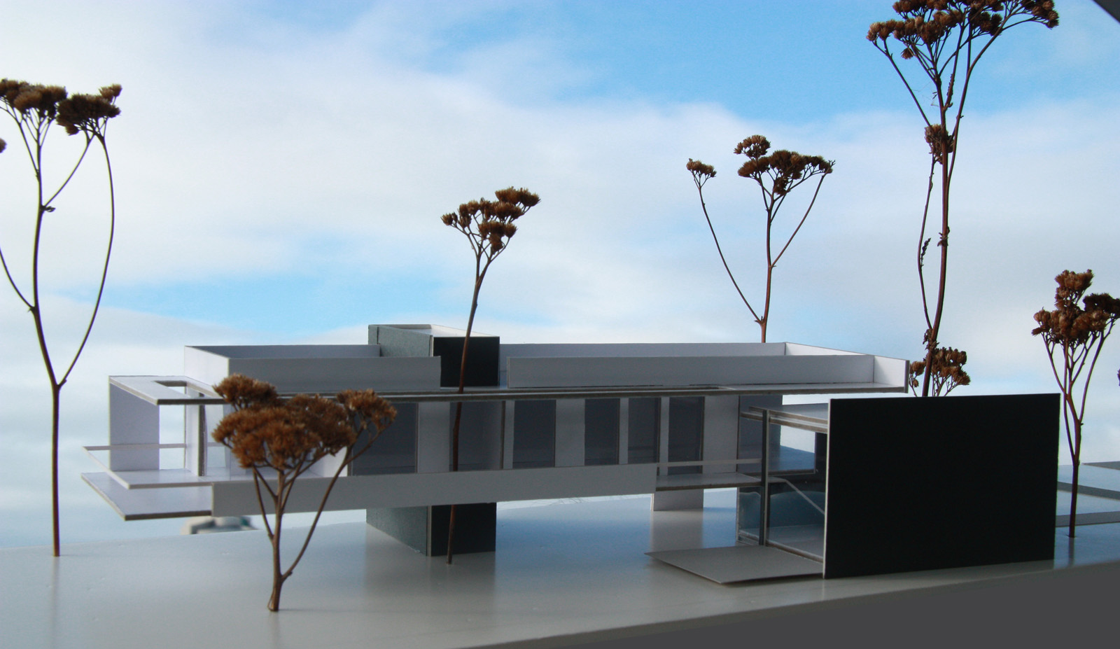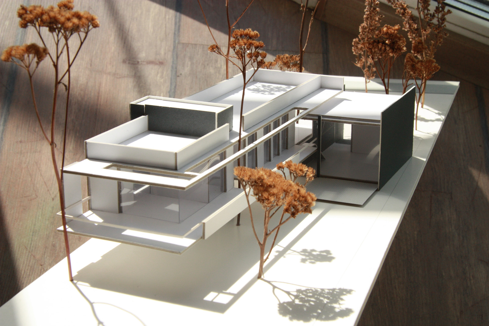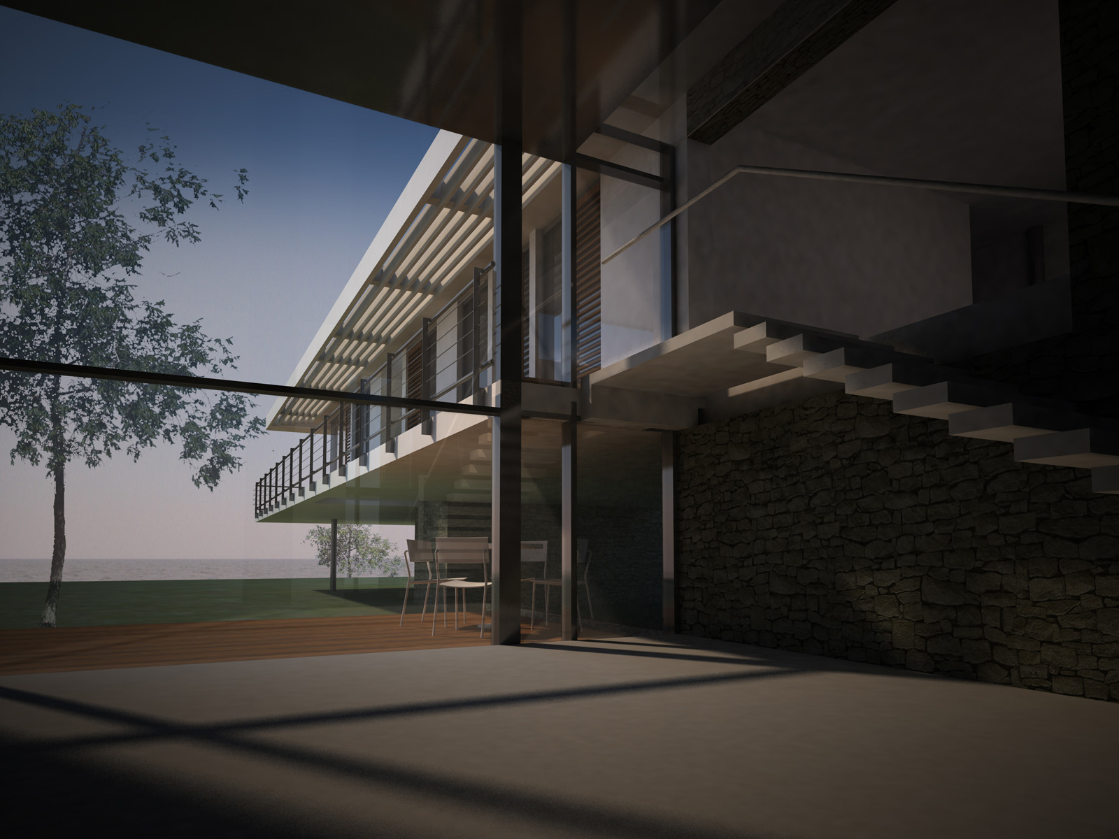 Участок расположен на береговой линии Балтийского моря, имеет ширину 17м и глубину 50м, ограничиваясь по фронту 40-метровым обрывом. Объем дома, включающий жилые помещения, поднят надуровнем земли и повернут в плане под углом к границам участка. Такое решение увеличивает площадь участка и выполняет главное требование заказчика: из окон каждого помещения открывается вид на море.