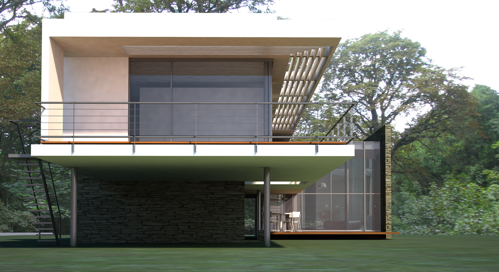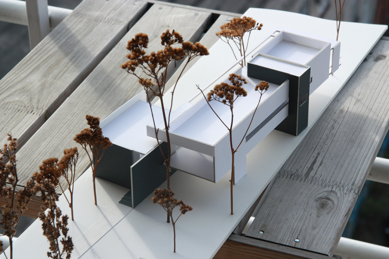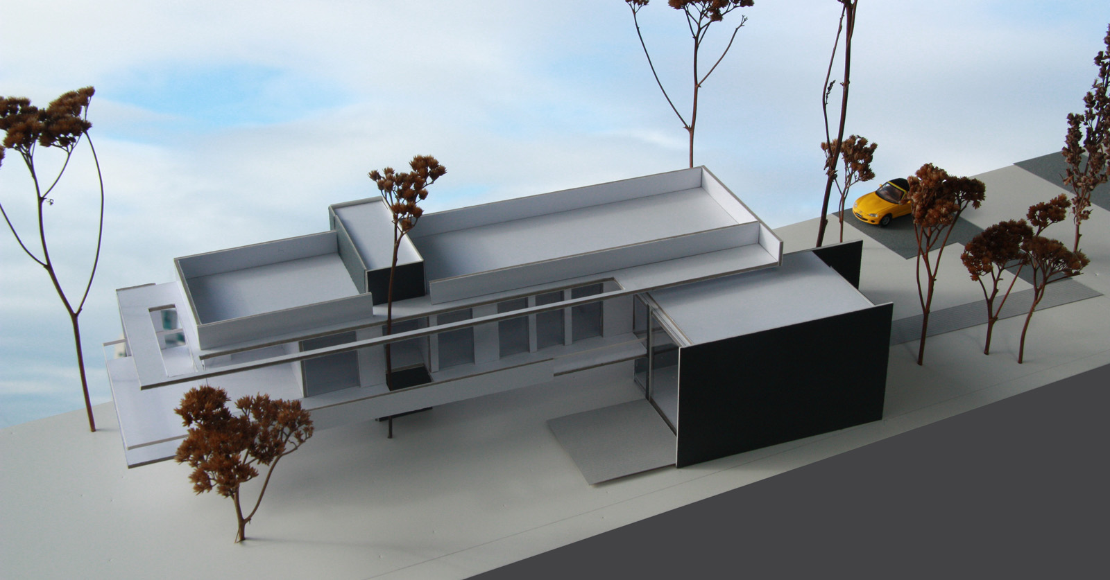 Участок расположен на береговой линии Балтийского моря, имеет ширину 17м и глубину 50м, ограничиваясь по фронту 40-метровым обрывом. Объем дома, включающий жилые помещения, поднят надуровнем земли и повернут в плане под углом к границам участка. Такое решение увеличивает площадь участка и выполняет главное требование заказчика: из окон каждого помещения открывается вид на море.