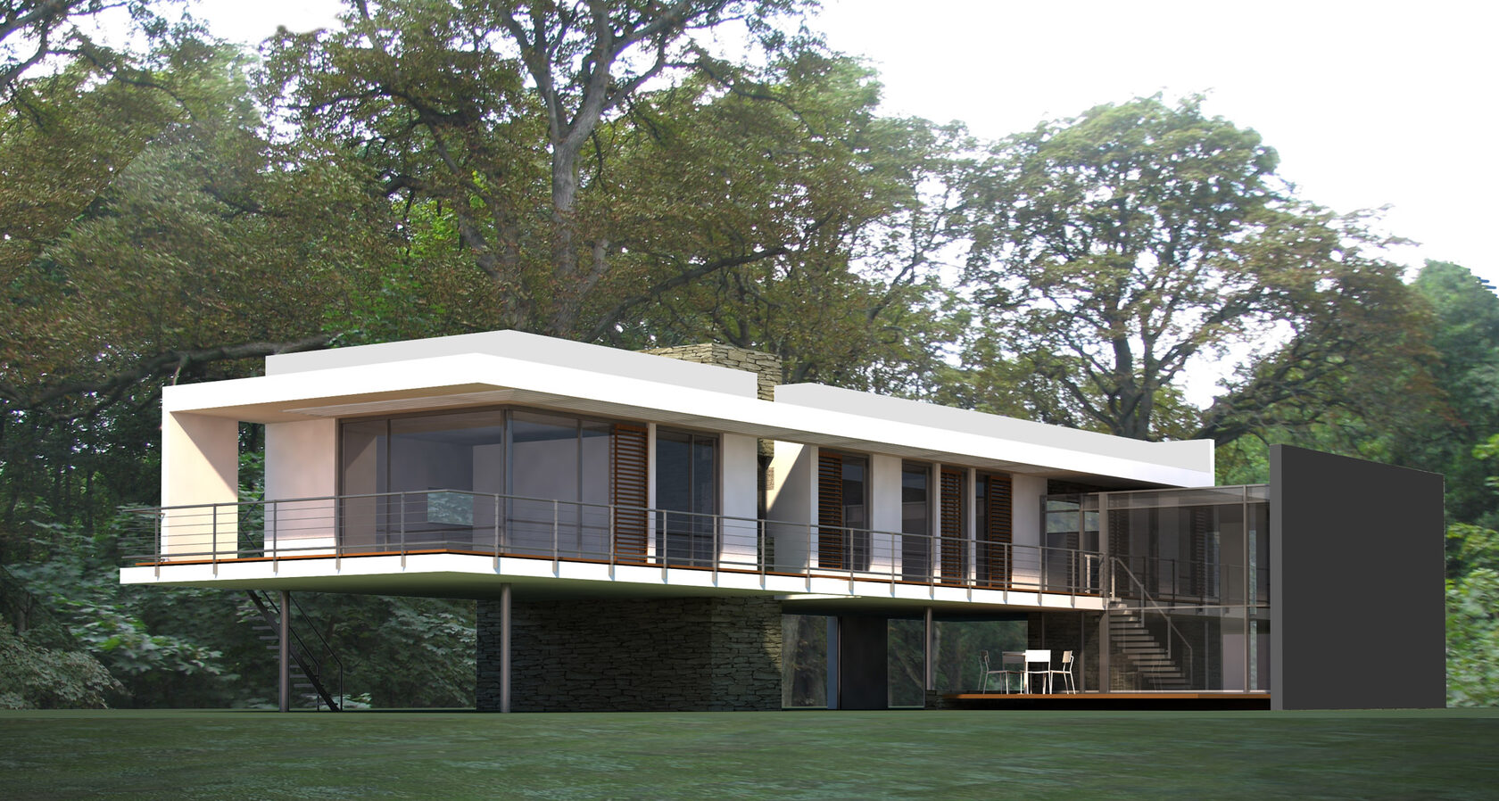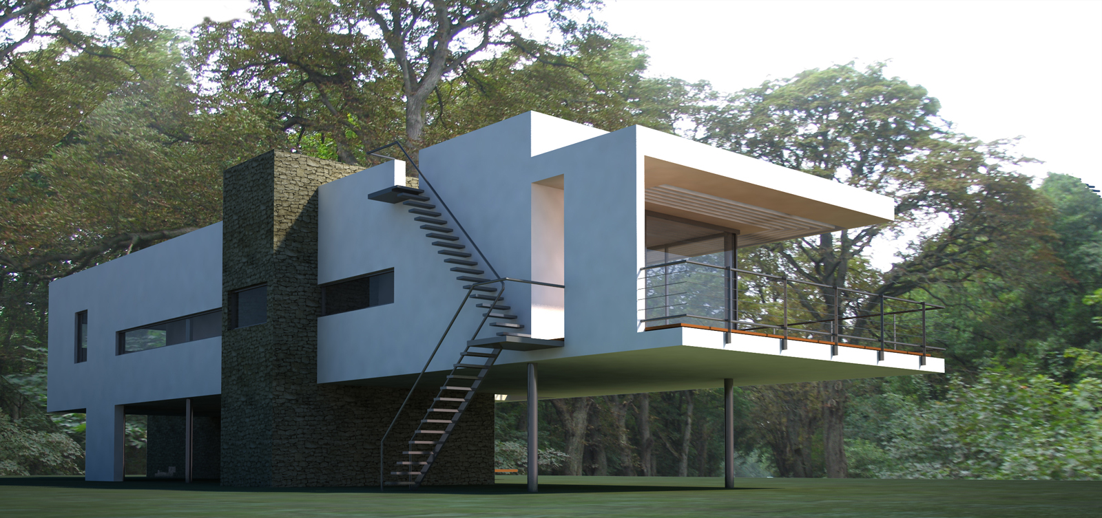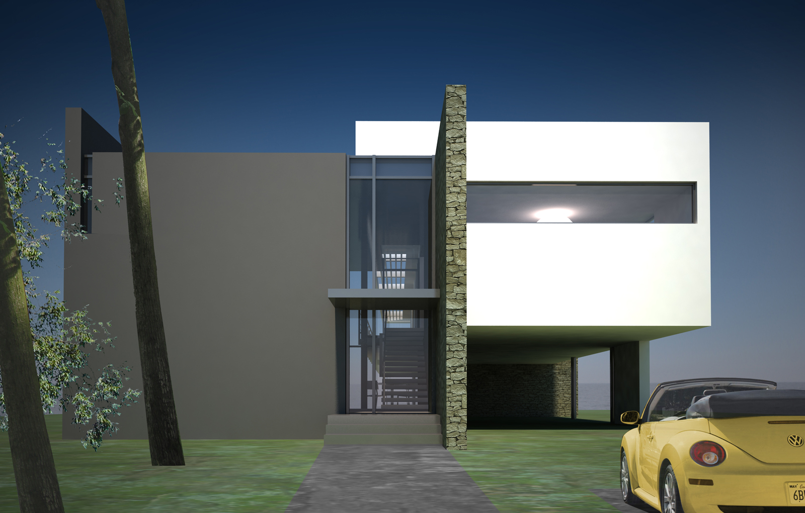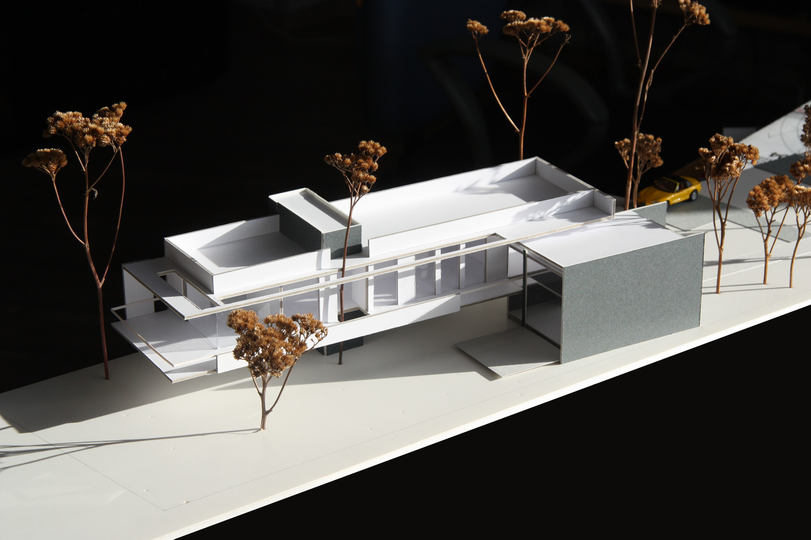 Участок расположен на береговой линии Балтийского моря, имеет ширину 17м и глубину 50м, ограничиваясь по фронту 40-метровым обрывом. Объем дома, включающий жилые помещения, поднят надуровнем земли и повернут в плане под углом к границам участка. Такое решение увеличивает площадь участка и выполняет главное требование заказчика: из окон каждого помещения открывается вид на море.