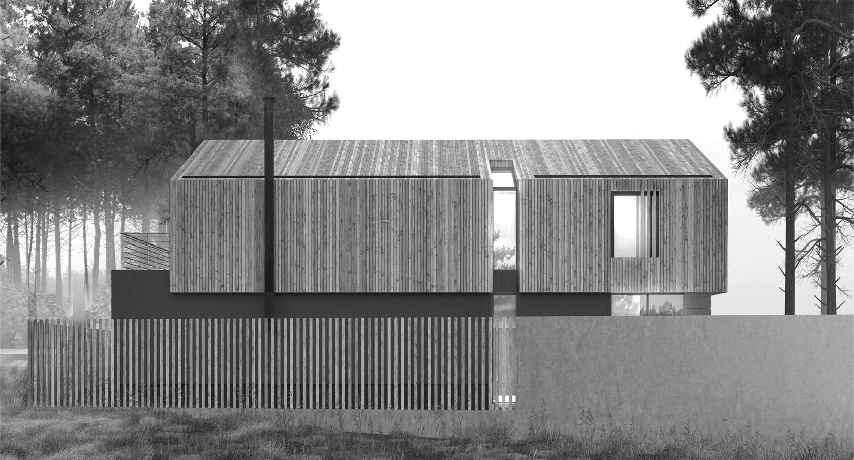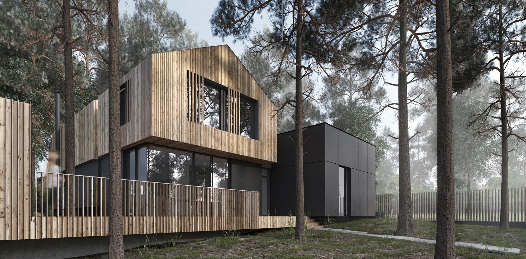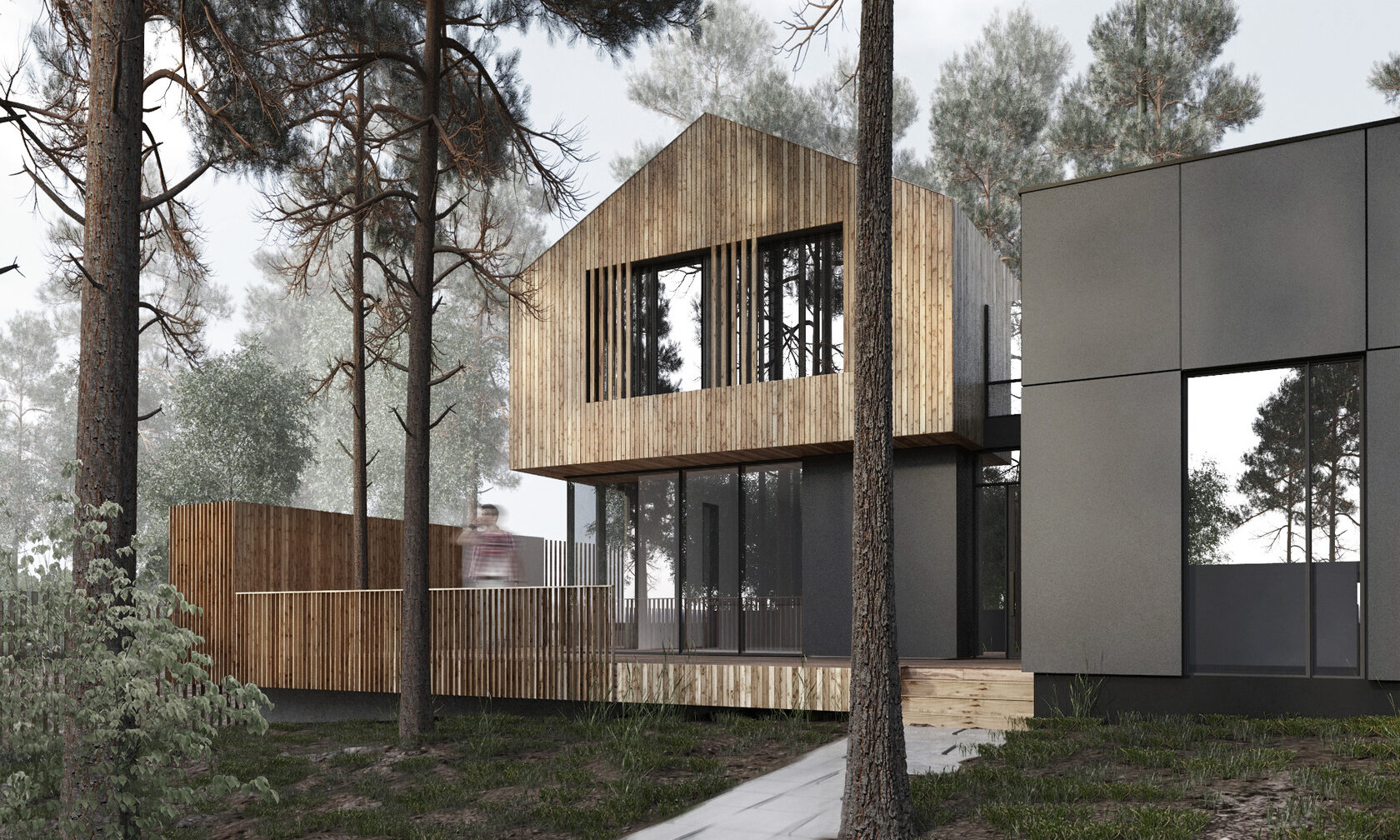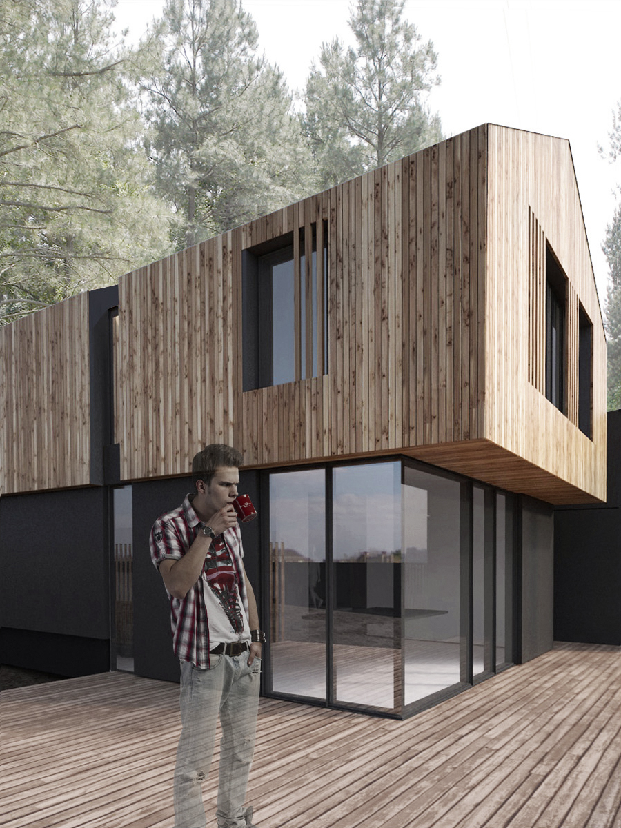 В дальнейшем, при необходимости увеличения площади основного здания, следует второй этап – возведение дополнительного одноуровневого, рядом стоящего объема, который будет соединен с главным домом стеклянным переходом. Фасадное решение нового пристроя идентично первому уровню основного дома. Благодаря строительству дополнительного объема, дом приобретет новые помещения спальни, мастерской и кабинета.