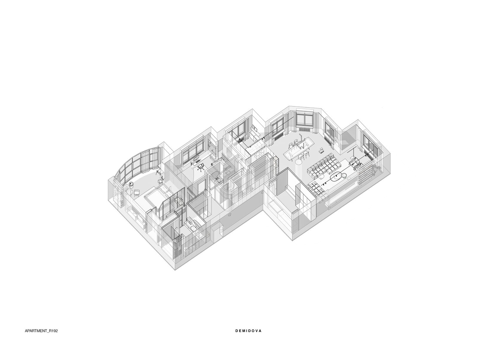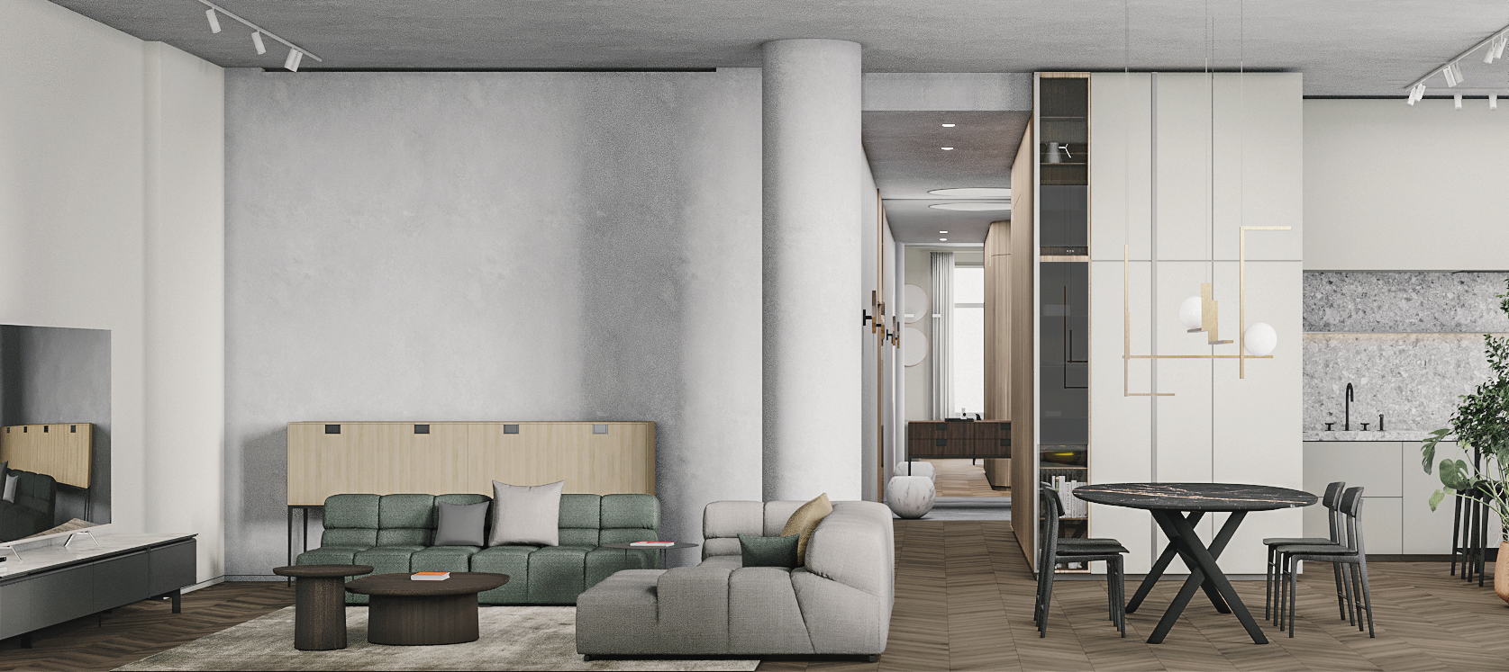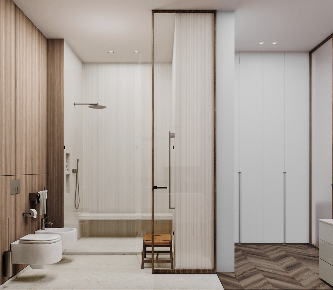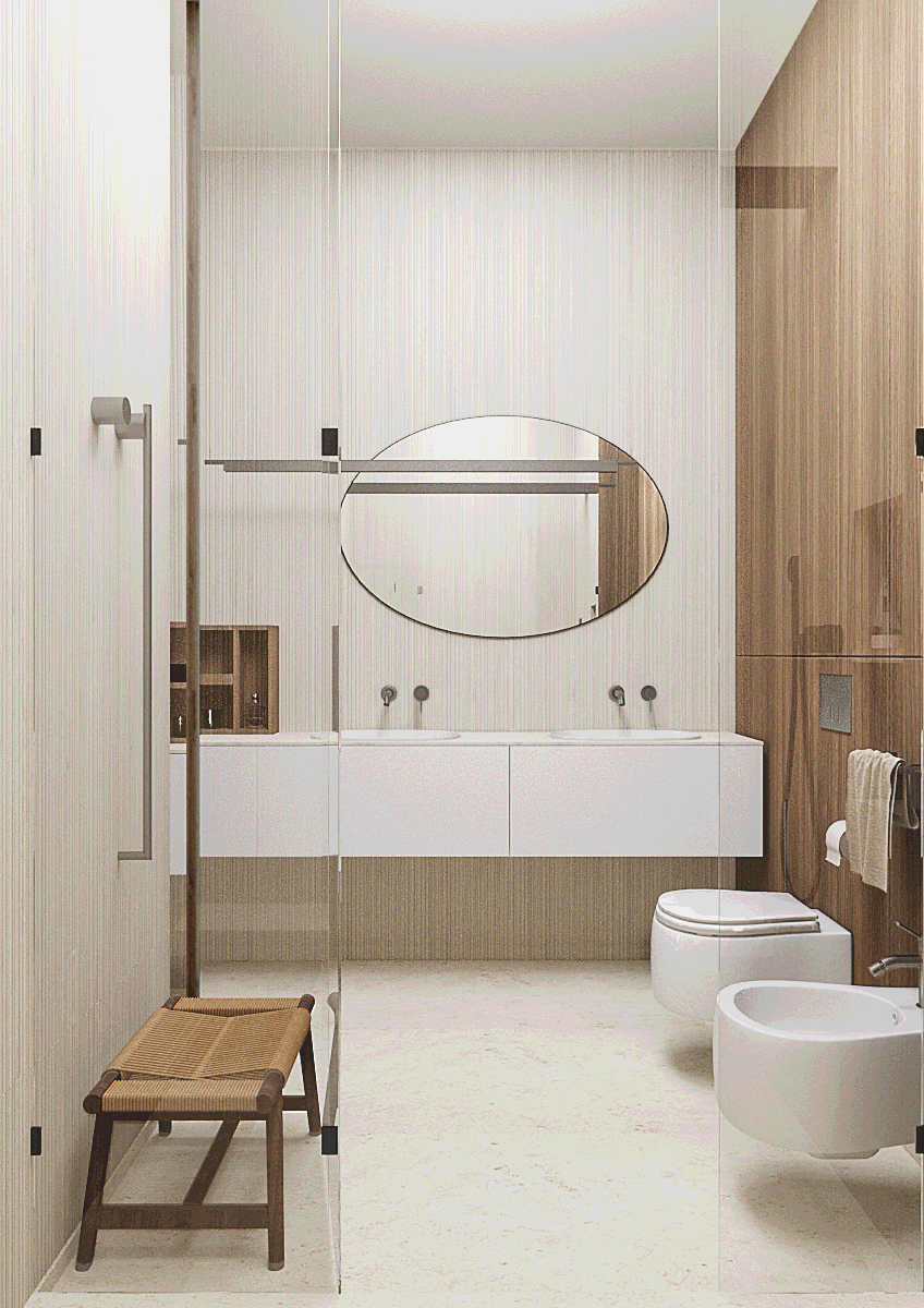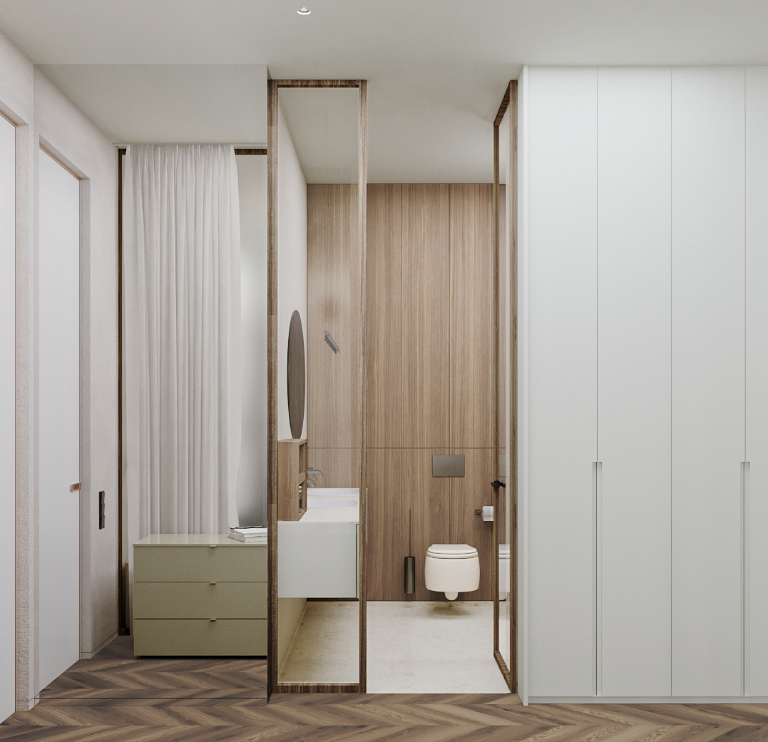 В левой части апартаментов запроектированная общая зона с гостиной, кухней, столовой и отдельным бытовым помещением. Спальные комнаты сосредоточены отдельным блоком и отдалены от шума, который характерен для манипуляций в общей зоне.