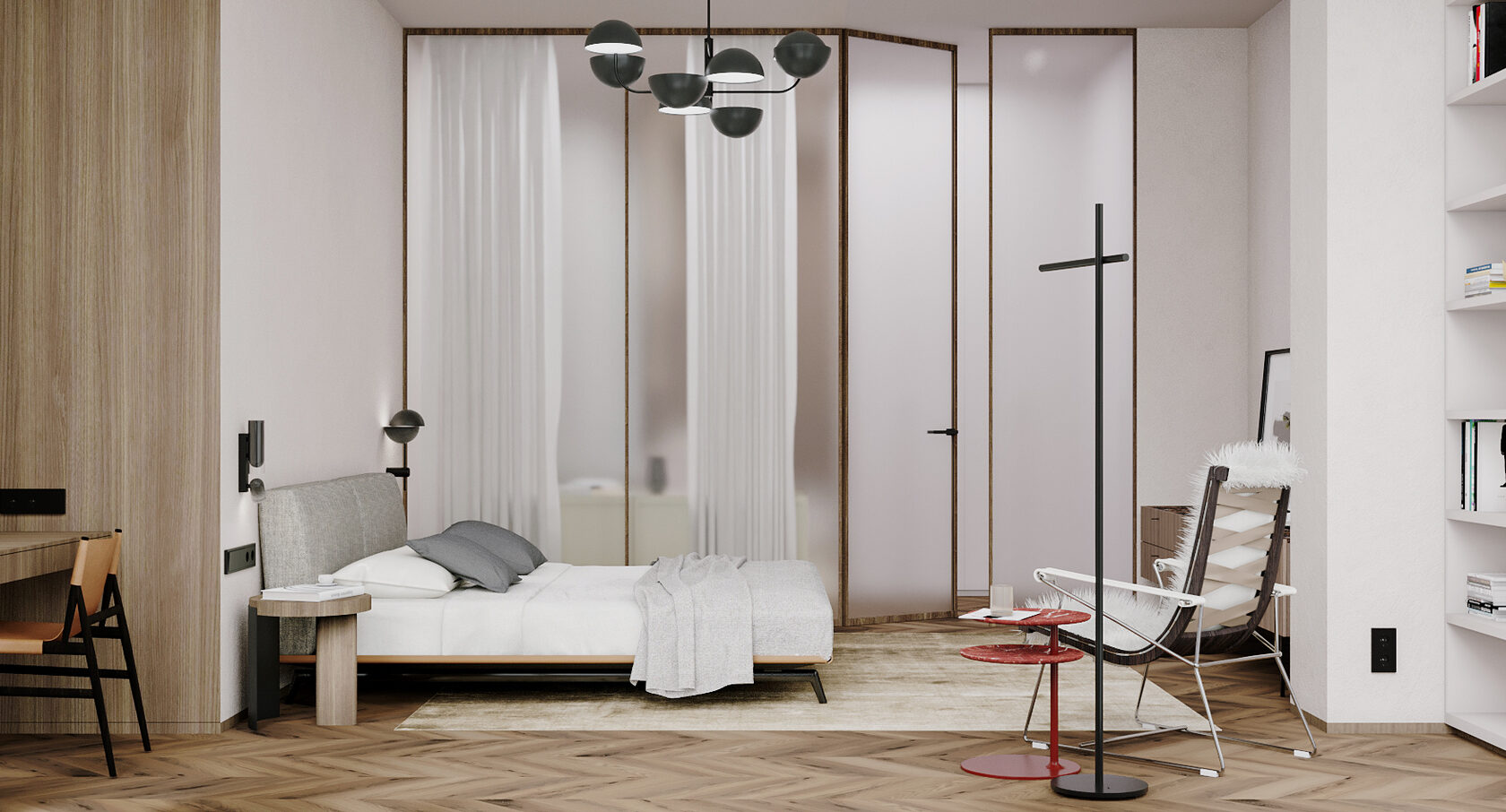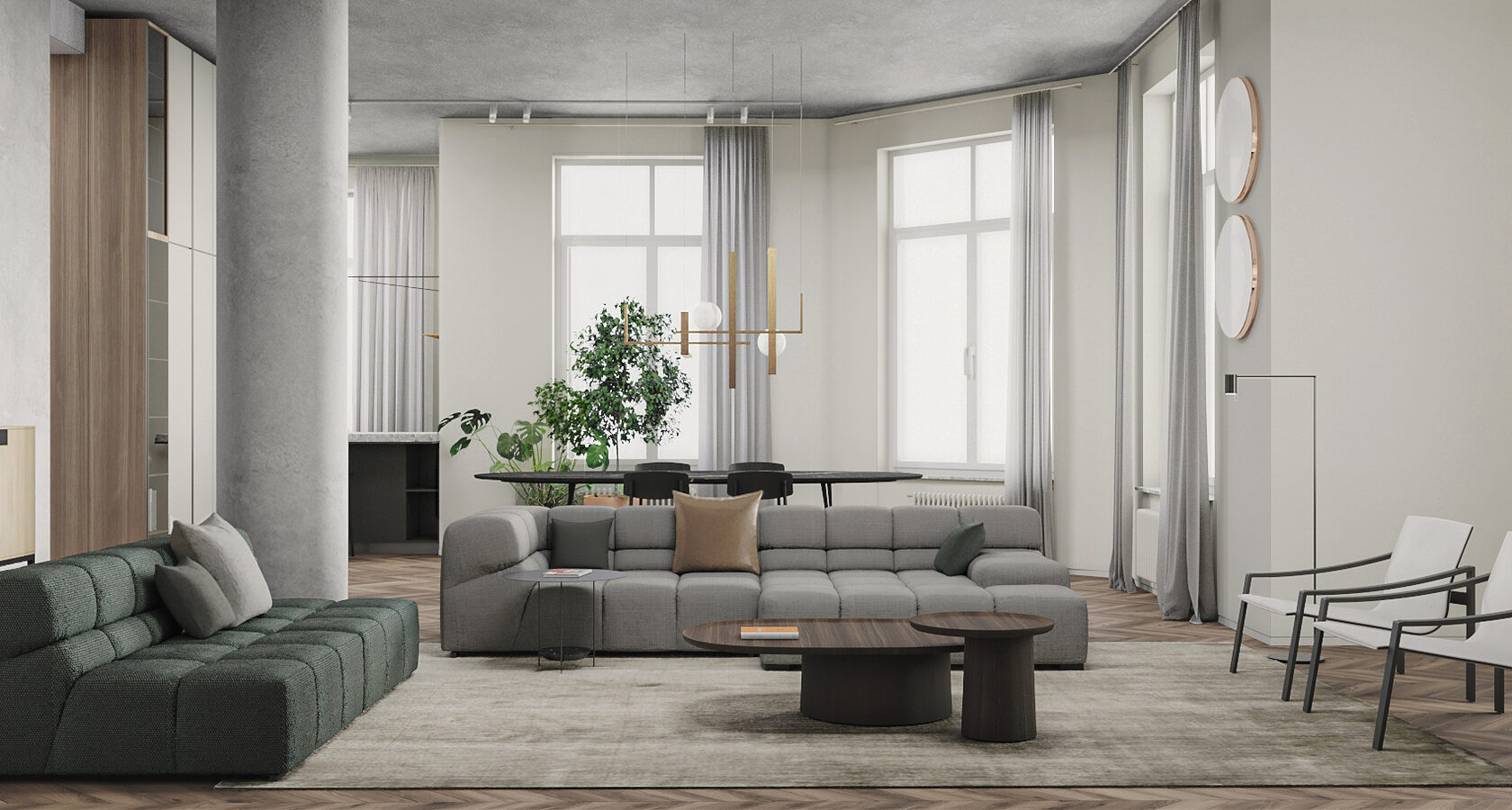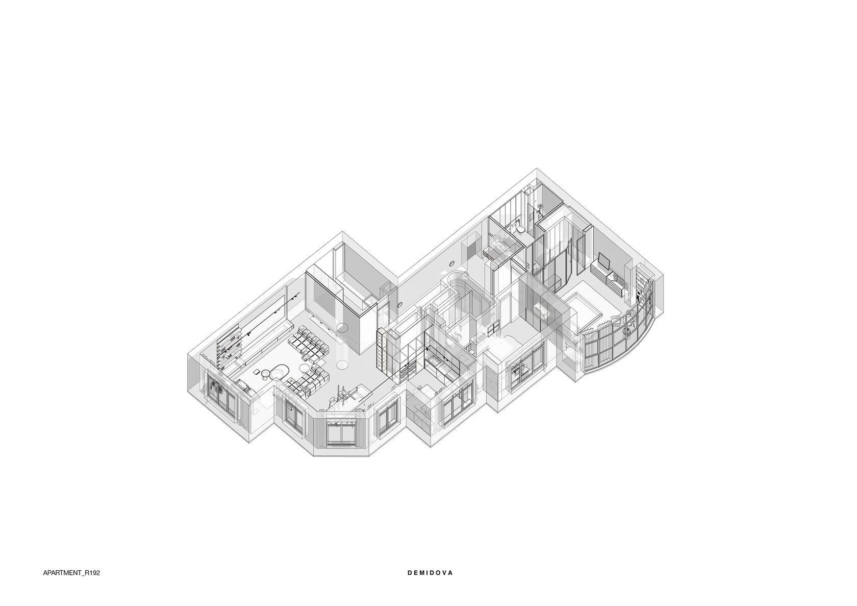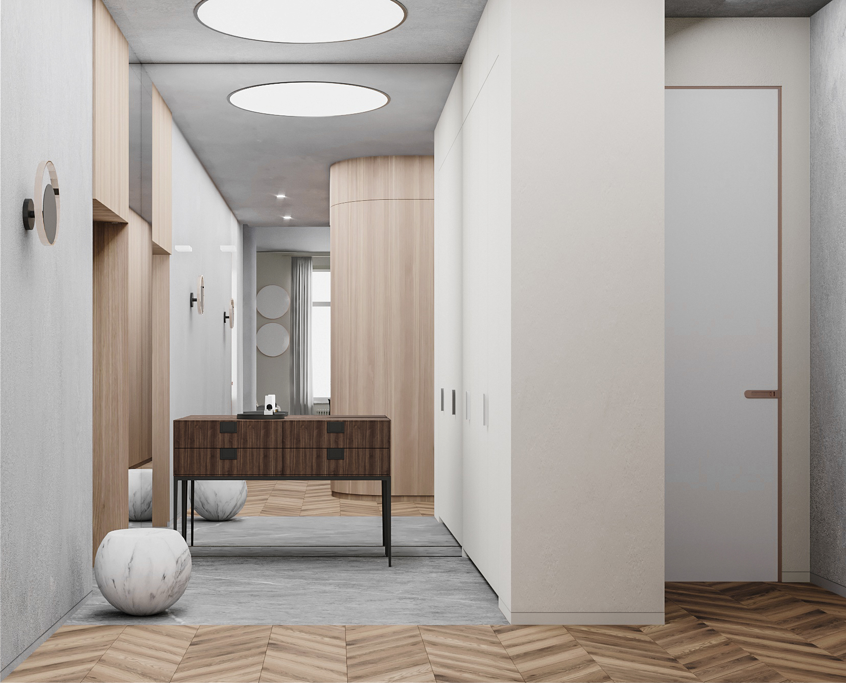 В левой части апартаментов запроектированная общая зона с гостиной, кухней, столовой и отдельным бытовым помещением. Спальные комнаты сосредоточены отдельным блоком и отдалены от шума, который характерен для манипуляций в общей зоне.