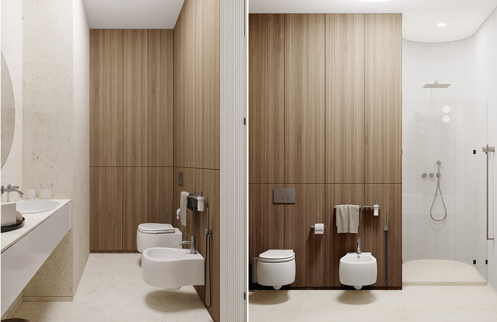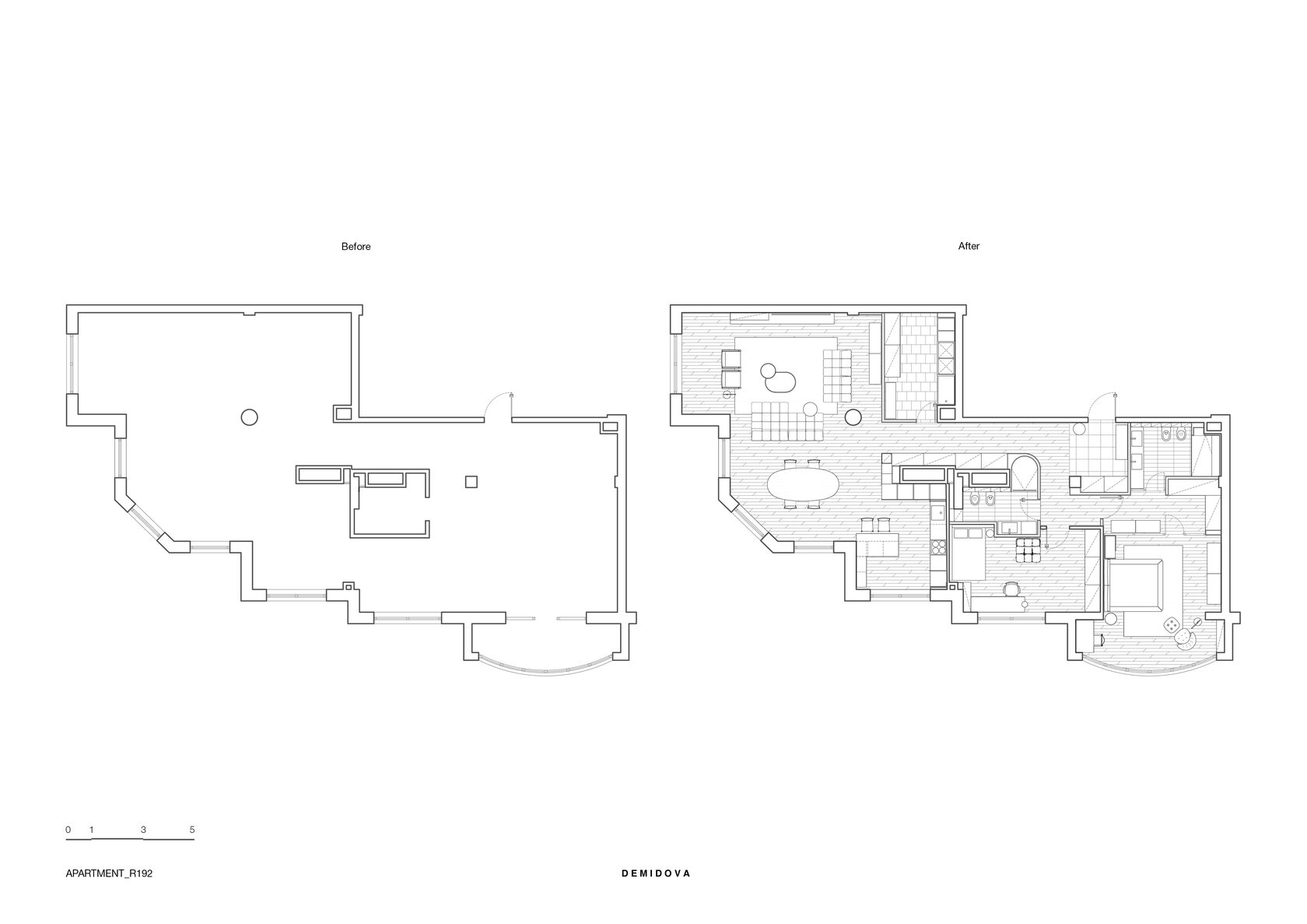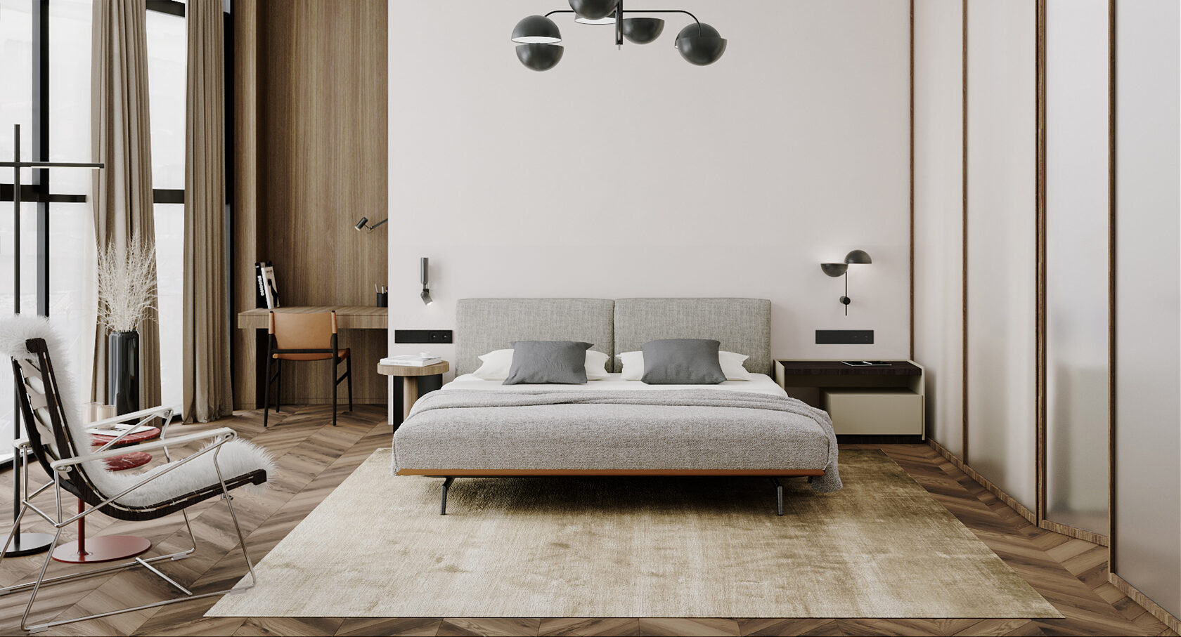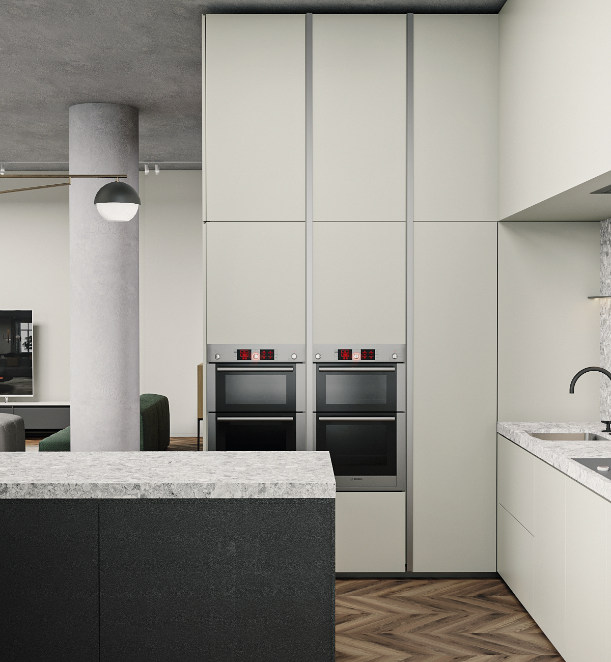 В левой части апартаментов запроектированная общая зона с гостиной, кухней, столовой и отдельным бытовым помещением. Спальные комнаты сосредоточены отдельным блоком и отдалены от шума, который характерен для манипуляций в общей зоне.