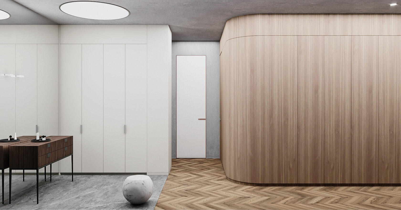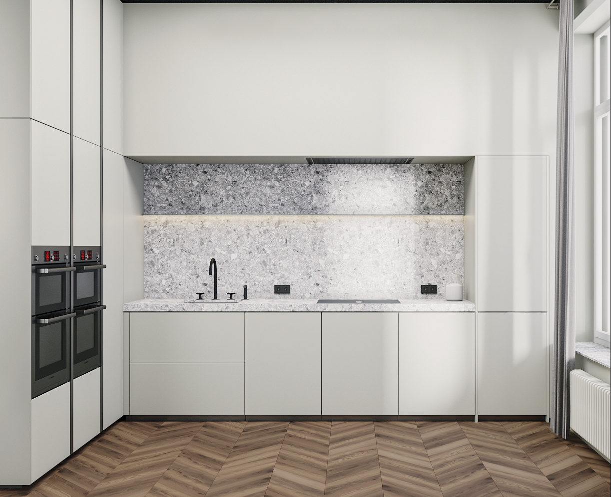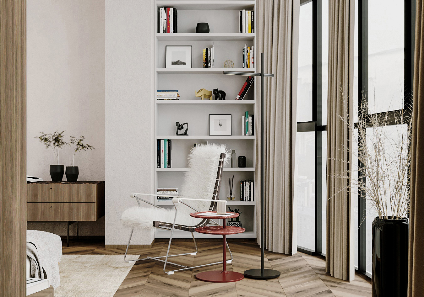 Функциональное пространство квартиры построено на простых формах, природных оттенках и смысловых акцентах в предметах искусства, книгах и мебели.
