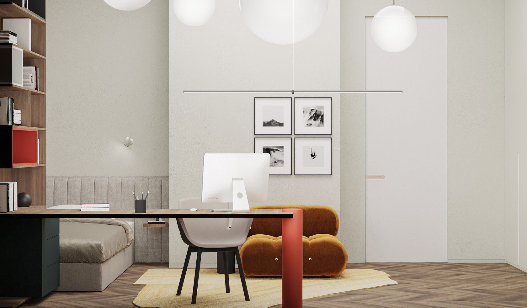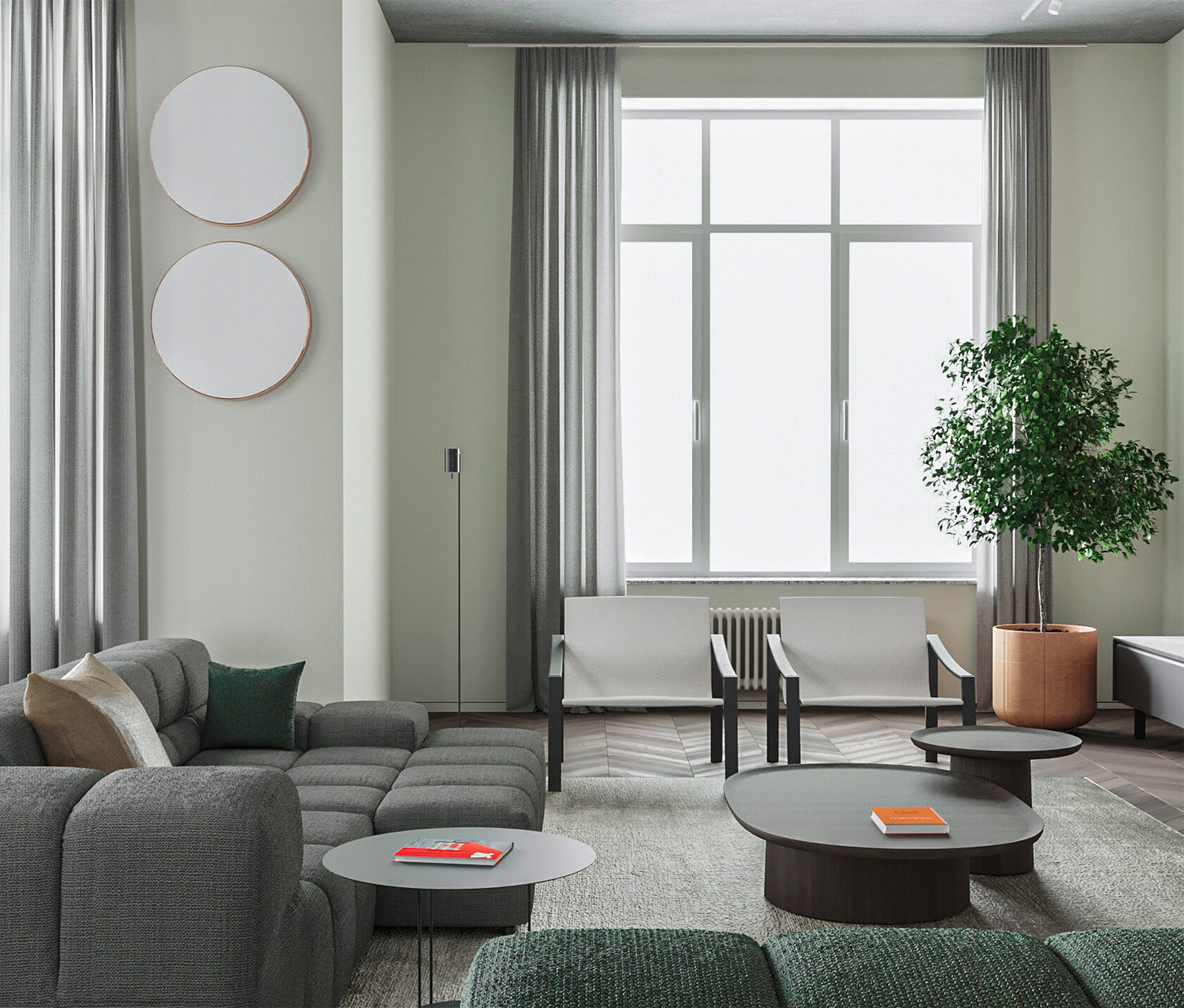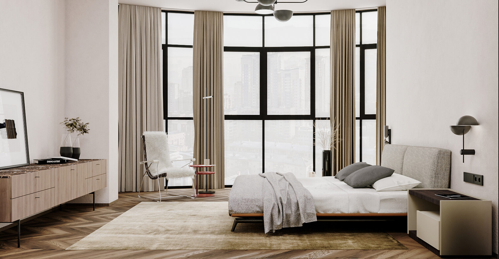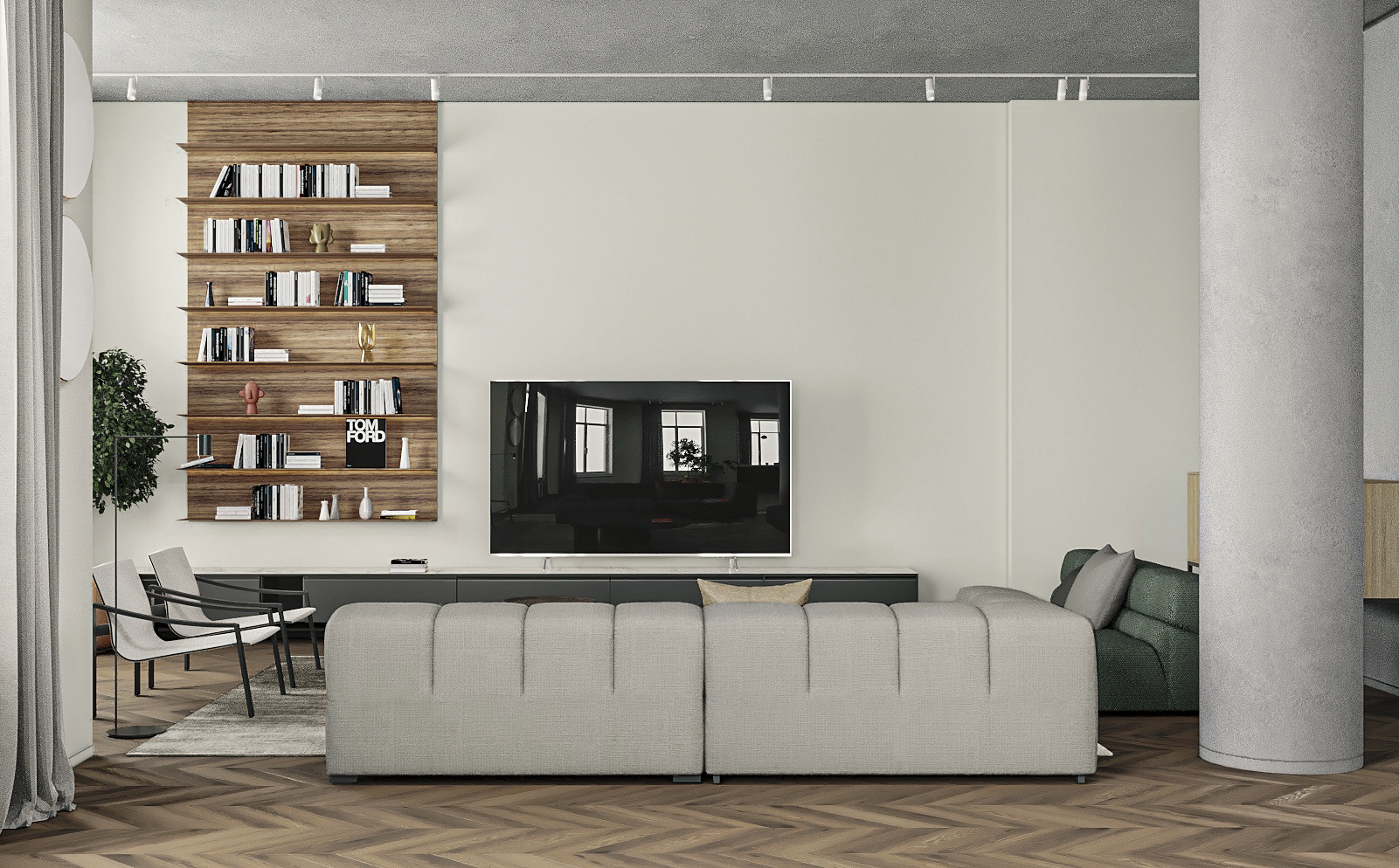 Функциональное пространство квартиры построено на простых формах, природных оттенках и смысловых акцентах в предметах искусства, книгах и мебели.