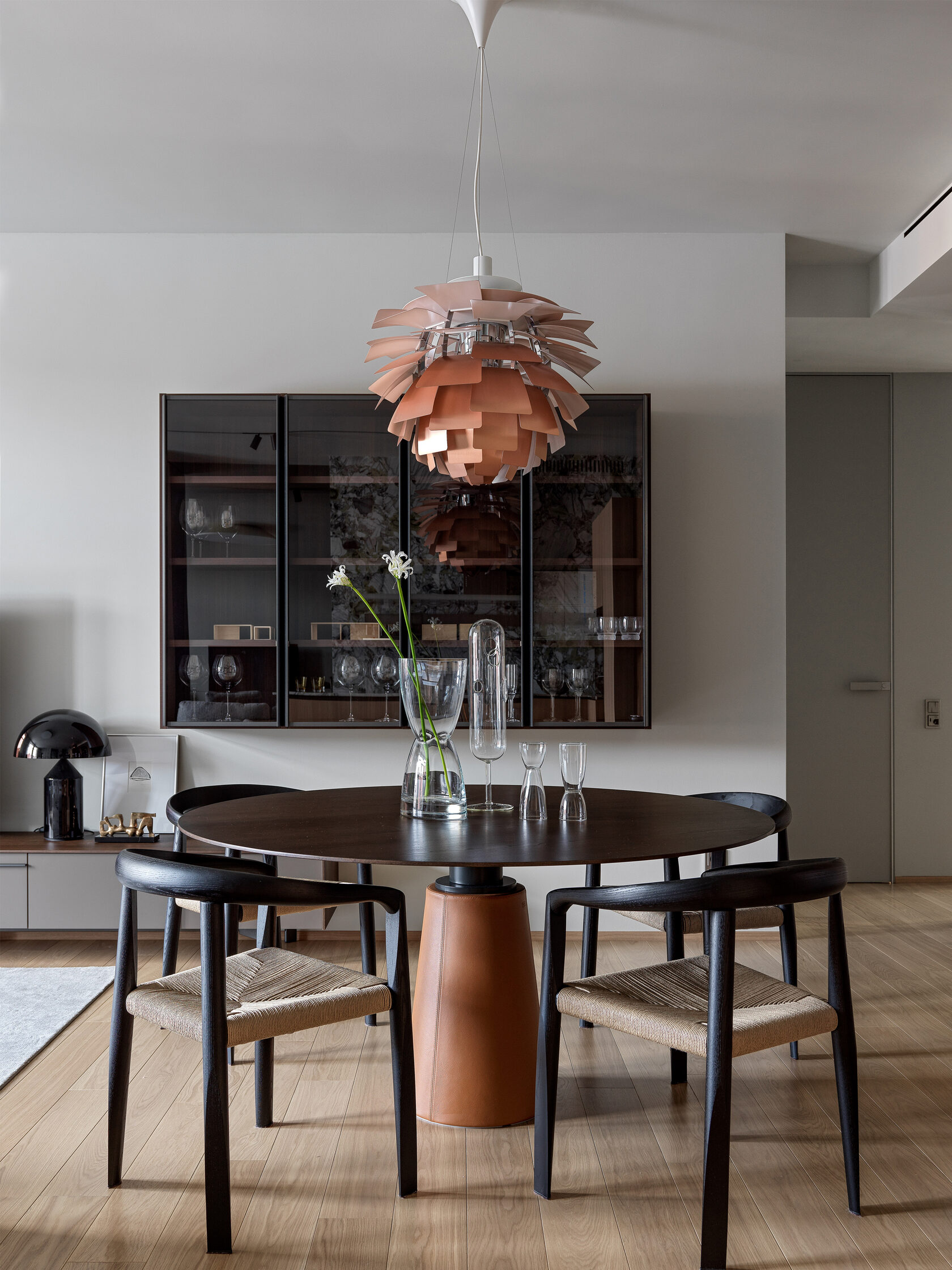 Часть акцентов интерьера приходится на мебель, которую можно отнести к произведениям искусства. Обеденную зону освещает оригинальный медный светильник Artichoke Poul Henningsen из юбилейной коллекции датской марки Louis Poulsen. Под ним расположен стол Mesa Due Poltrona Frau простой геометрии с основанием, обтянутым натуральной кожей. Стол дополнен классическими стульями MHC.3 MISS итальянской фабрики Molteni&C.