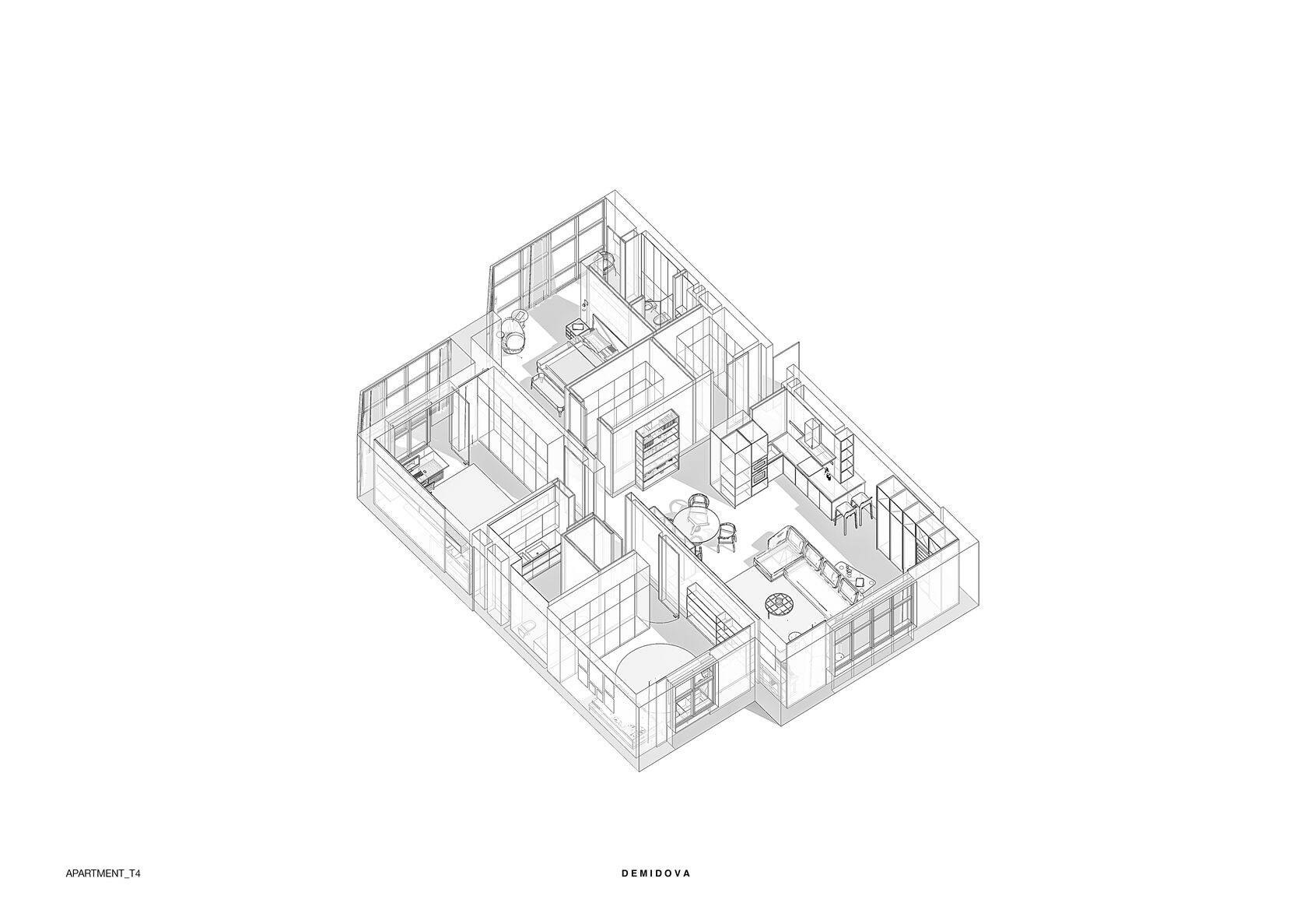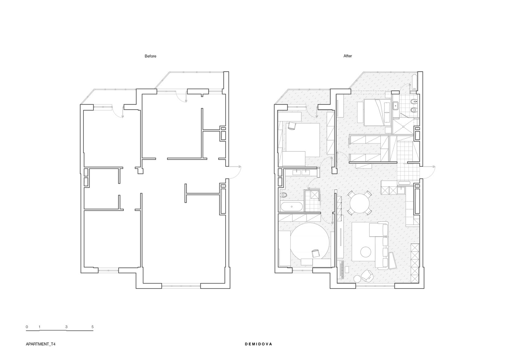 Перепланировка позволила создать общую зону, объединяющую кухню, столовую и гостиную. За счёт демонтажа стен лоджии удалось увеличить пространство и добавить больше естественного света в главную спальню с собственной ванной и гардеробной. Две детские спальни с отдельным санузлом расположили друг напротив друга.