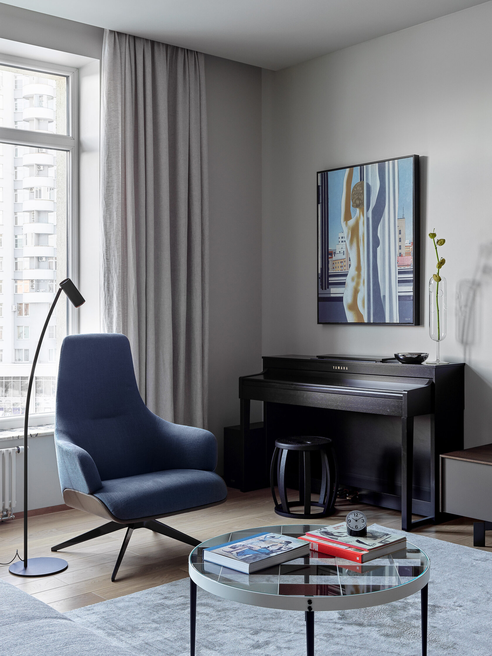 В зоне гостиной, возле дивана, размещён журнальный столик D.555.1 производства той же фабрики. Стол с выкрашенным вручную геометричным основанием создан итальянским архитектором Джо Понти (Giò Ponti) в первой половине XX века.