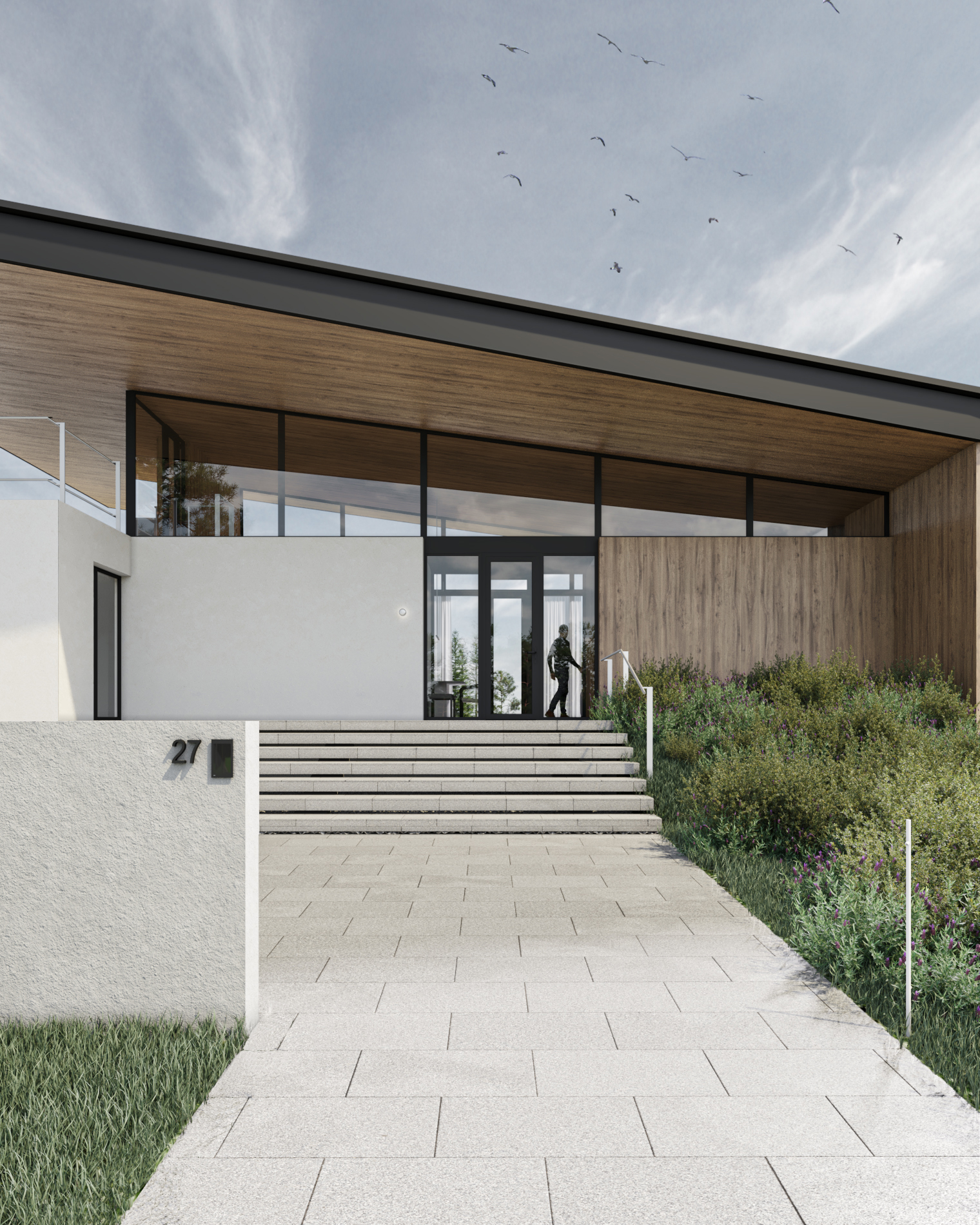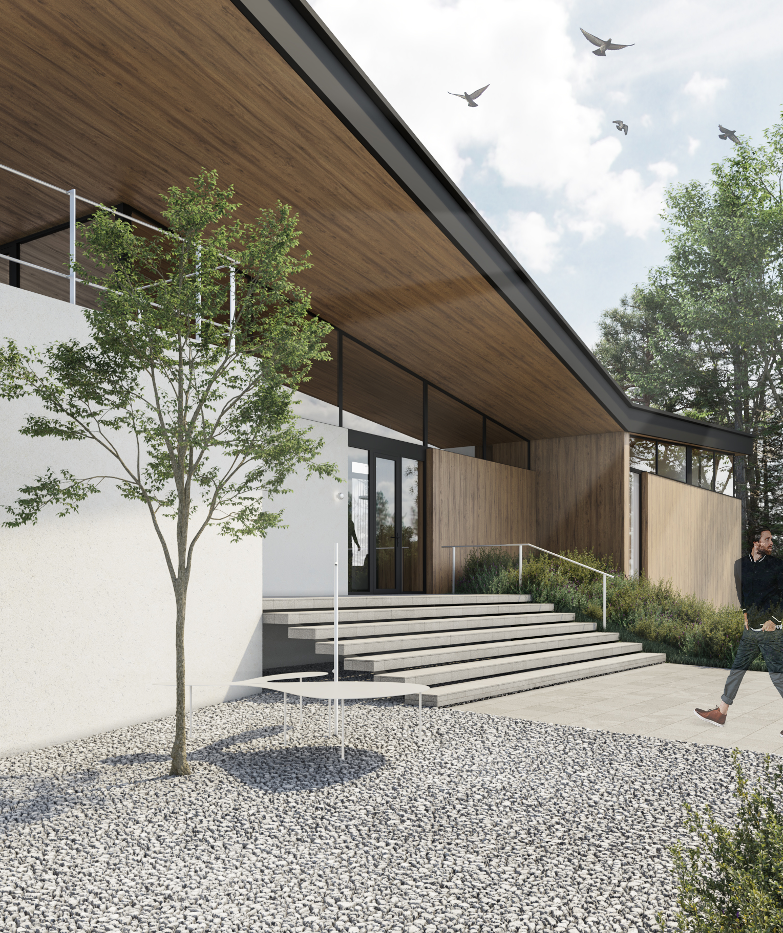 В облицовке фасадов использованы два основных материала - натуральный камень «змеевик» и термостойкая древесина. Оба материала применены как во внешней, так и во внутренней отделке дома. Термостойкая древесина в облицовке нижней поверхности кровли имеет продолжение внутри дома.