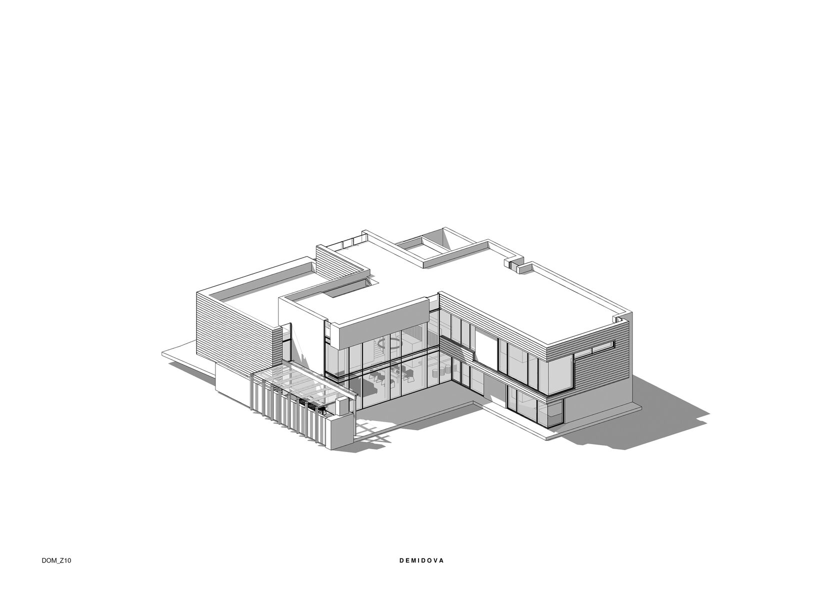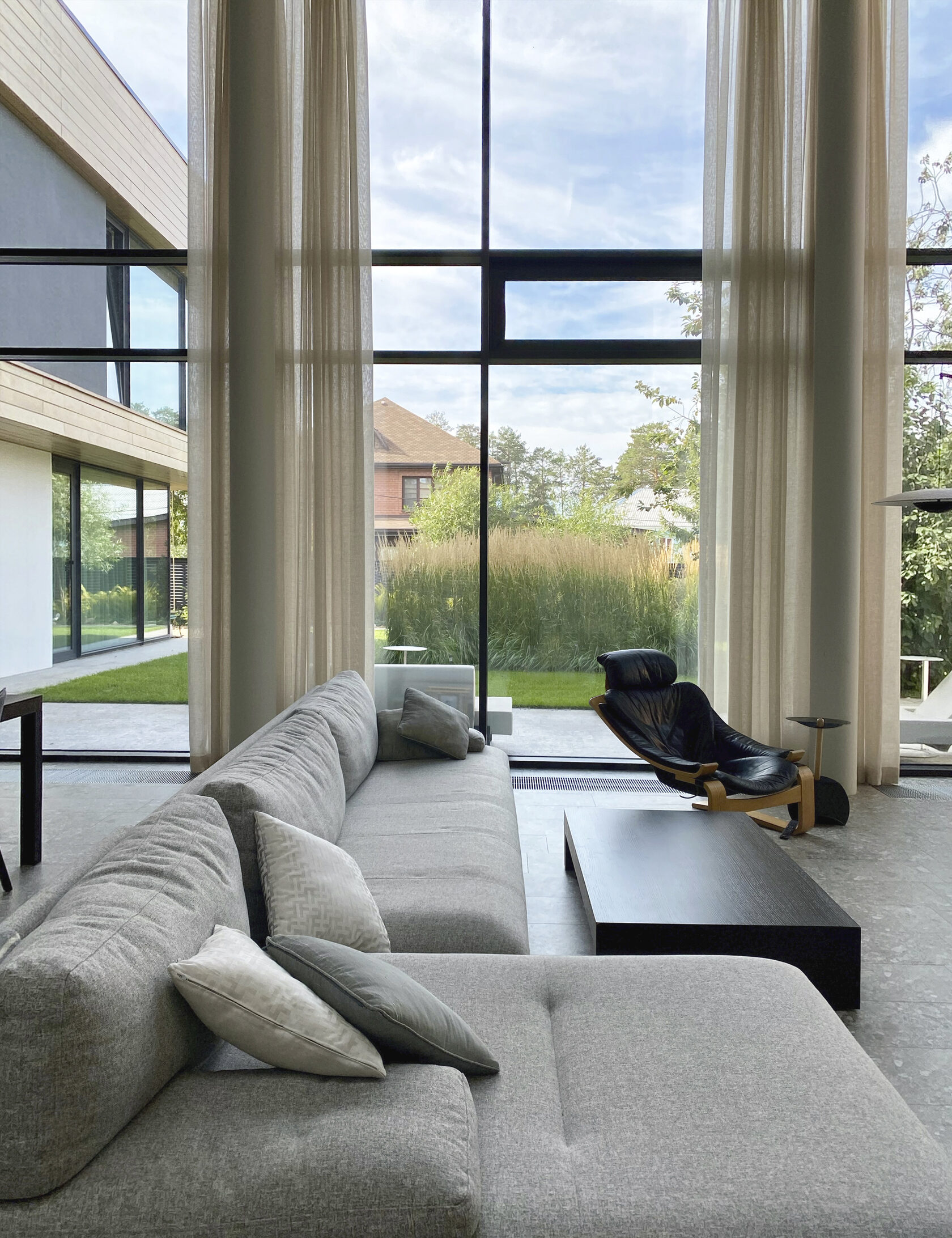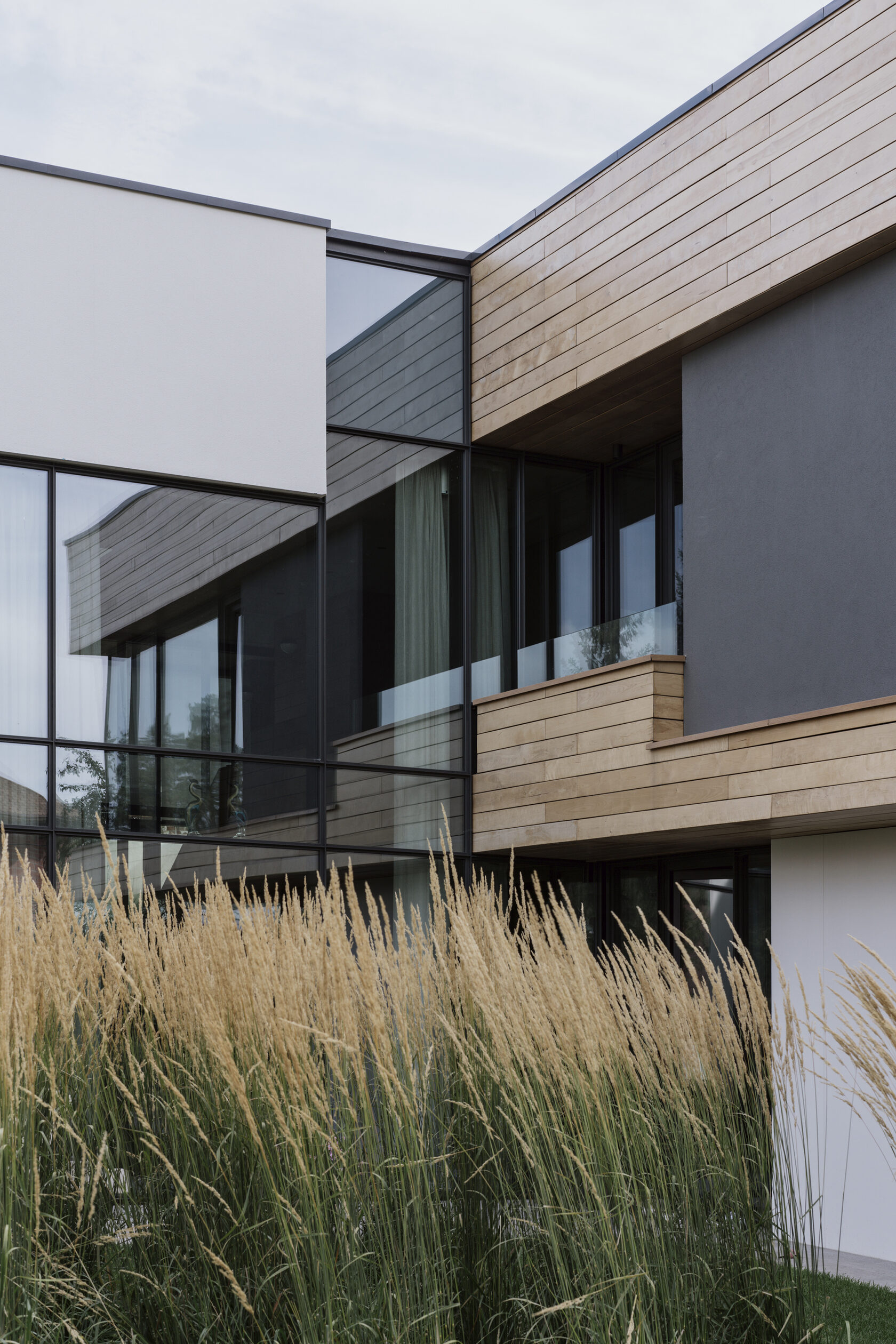 С восточной стороны — стороны главного фасада — дом заглубили на 1,5 метра, благодаря чему визуально он воспринимается как одноуровневый, а с западной стороны предстаёт в полном двухэтажном объёме. «L-образная» форма дома позволила организовать внутренний двор, скрытый от посторонних глаз.