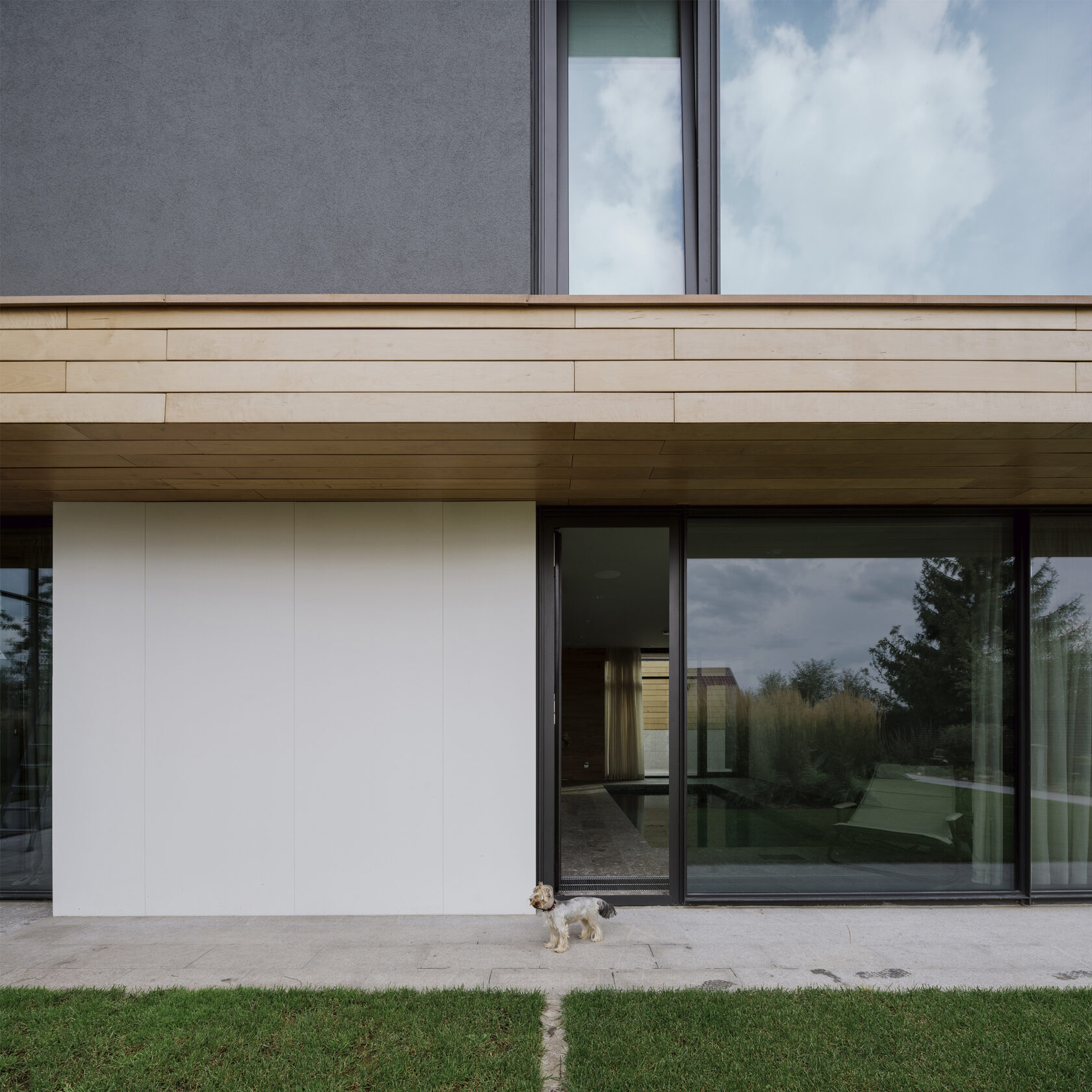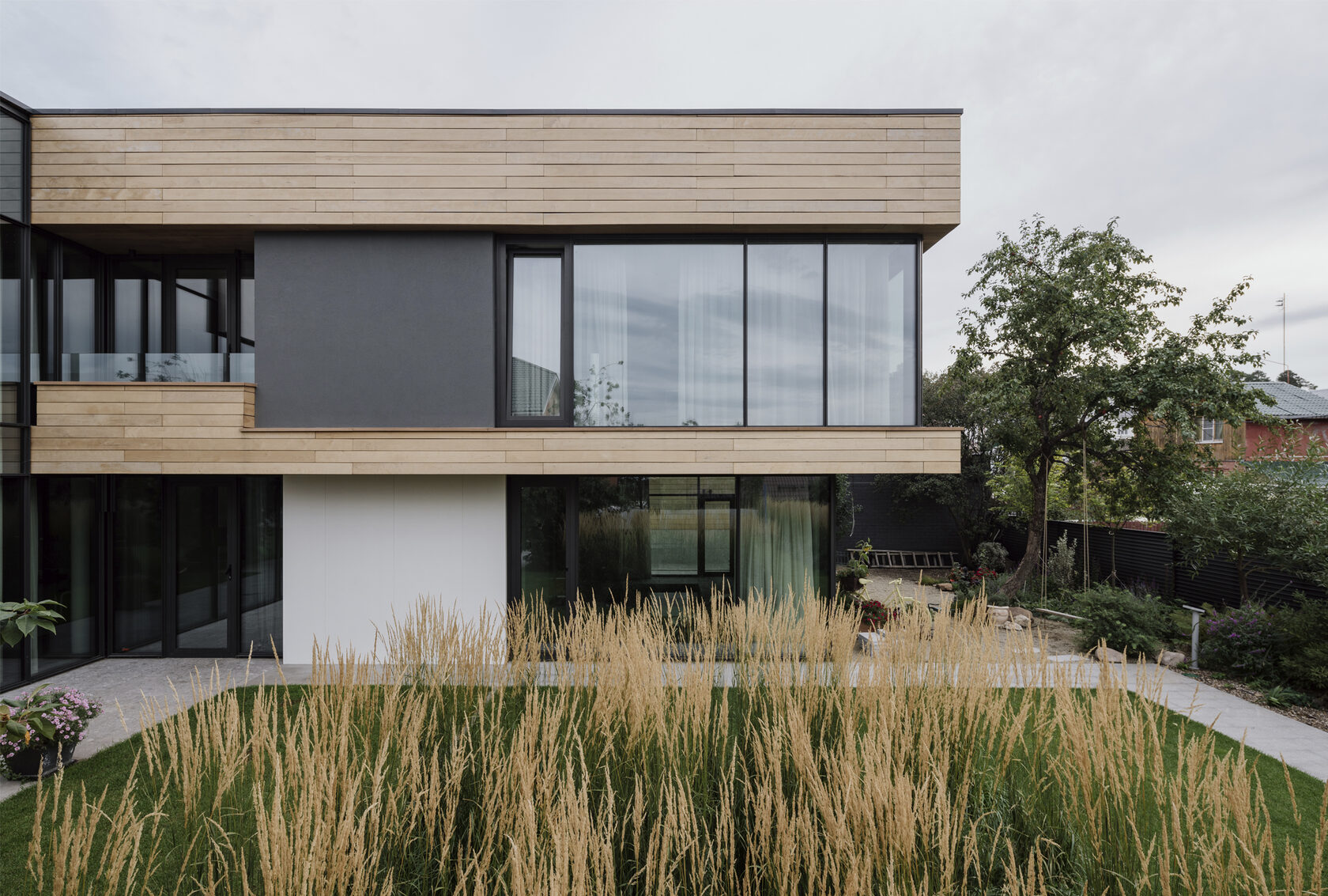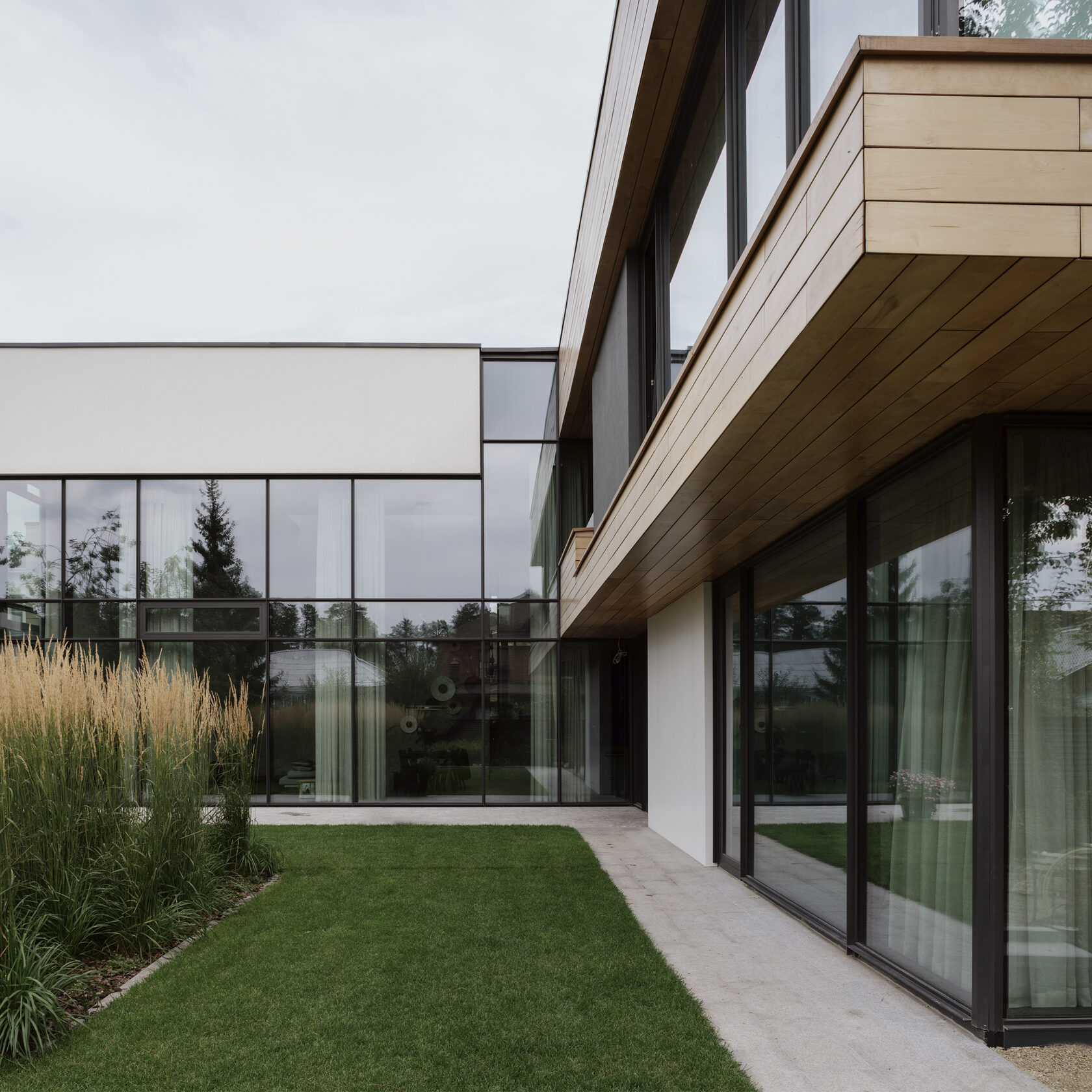 С восточной стороны — стороны главного фасада — дом заглубили на 1,5 метра, благодаря чему визуально он воспринимается как одноуровневый, а с западной стороны предстаёт в полном двухэтажном объёме. «L-образная» форма дома позволила организовать внутренний двор, скрытый от посторонних глаз.