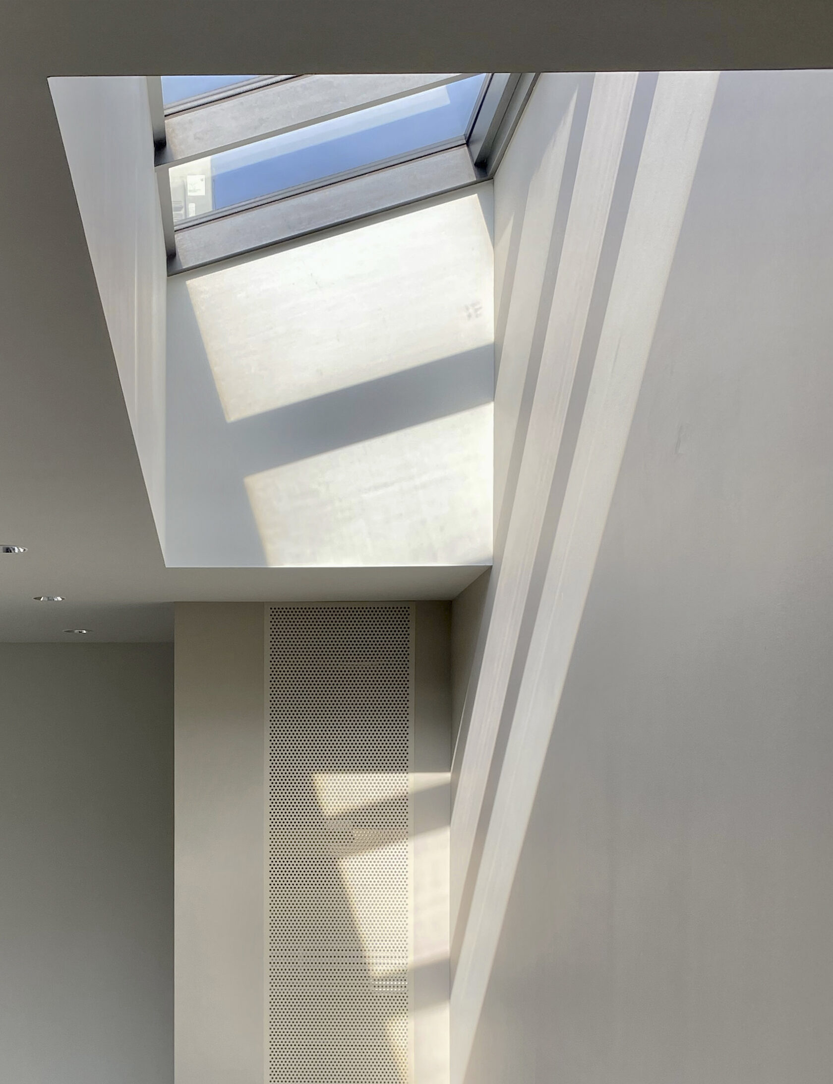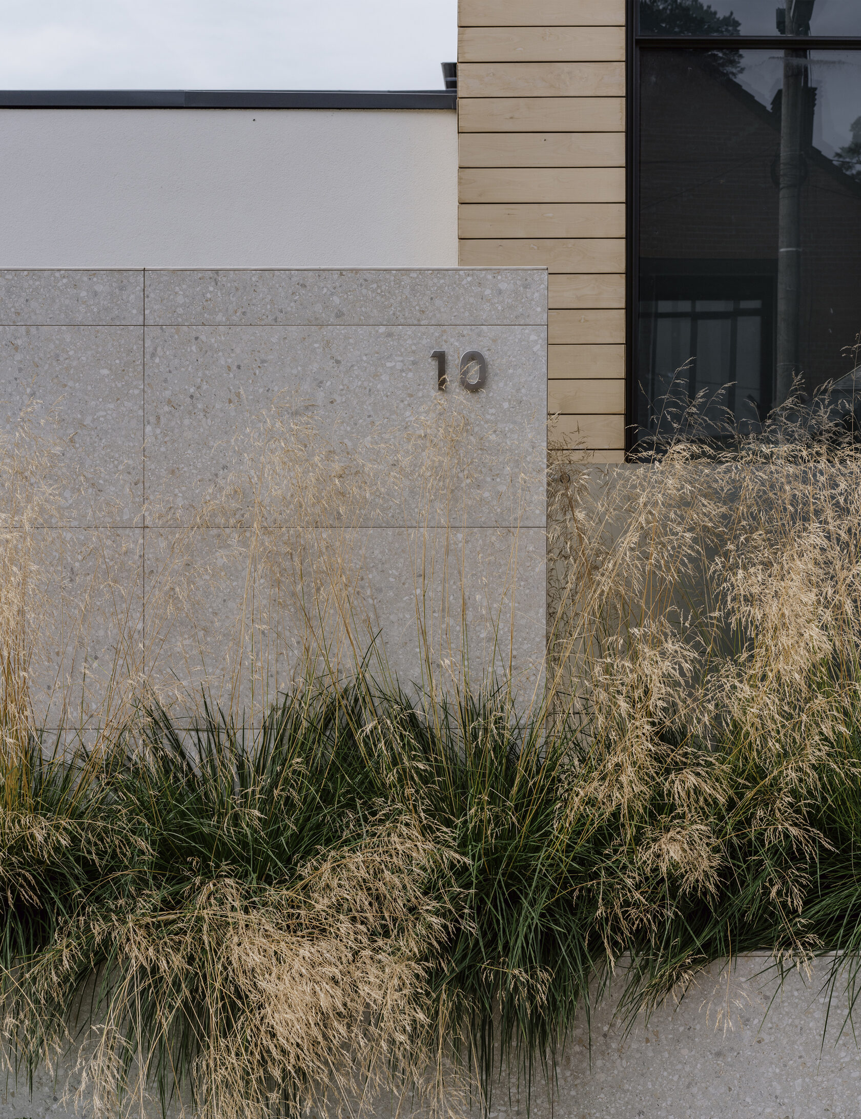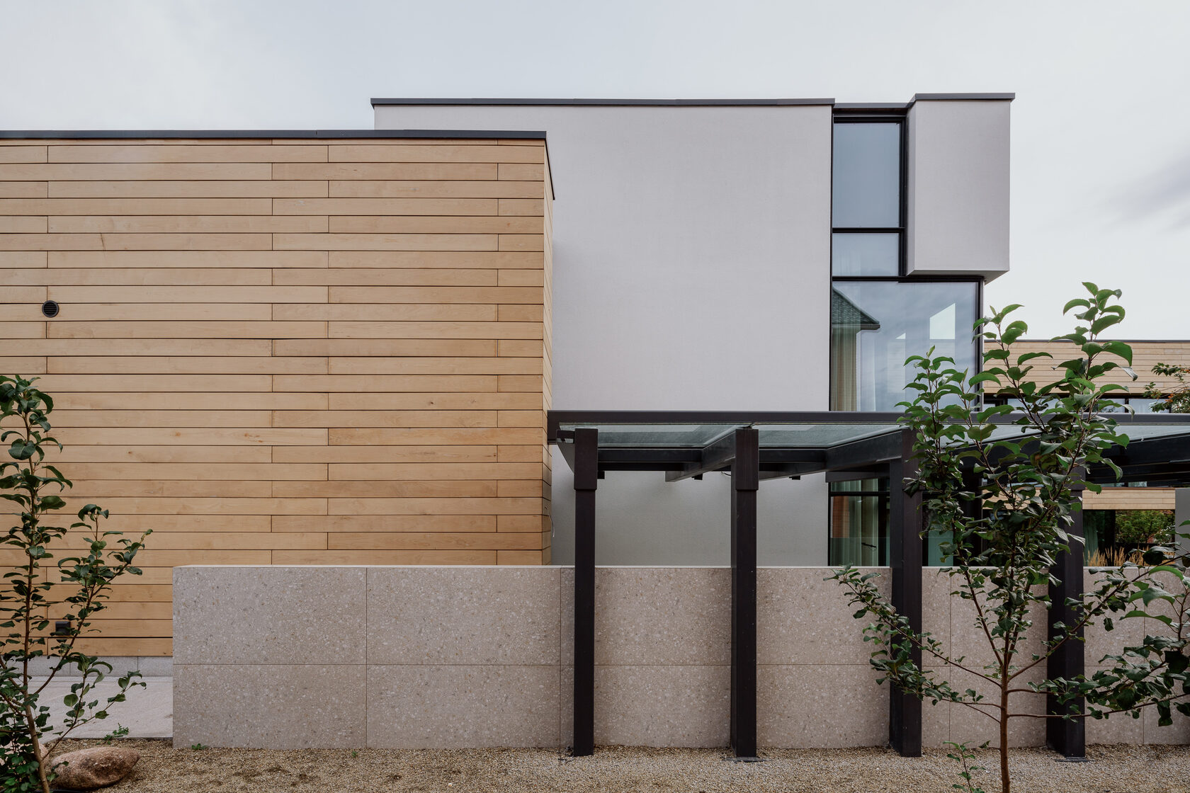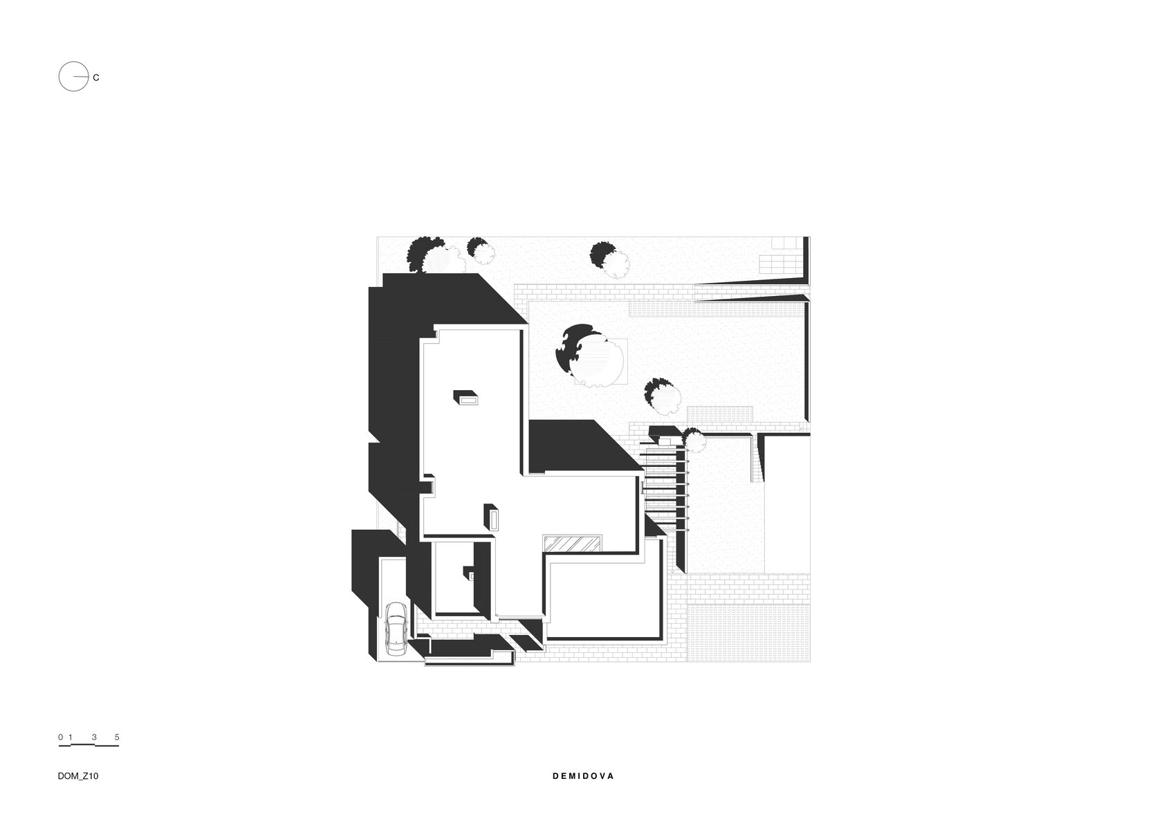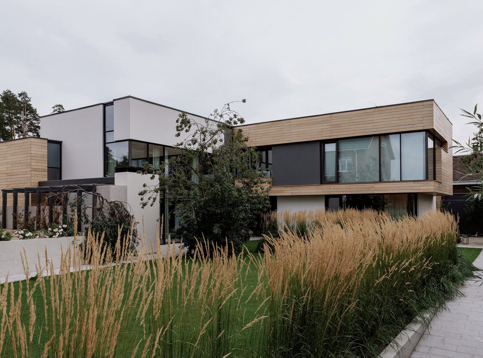 Запроектировать дом предстояло на участке 920 м2 со сложным перепадом рельефа: уклоном в направлении с востока на запад. Чтобы гармонично разместить объем на территории и сделать пространство дома и участка комфортными, разработан комплекс ландшафтных и архитектурных решений. Вместе с «Ландшафтной мастерской Сергеевых» была продумана система дорожек и пандусов. Так как соседние участки принадлежат семье заказчика, важно было соединить их с новым домом пешеходными связями и организовать территорию без резких перепадов, чтобы дети могли безопасно кататься на велосипедах.