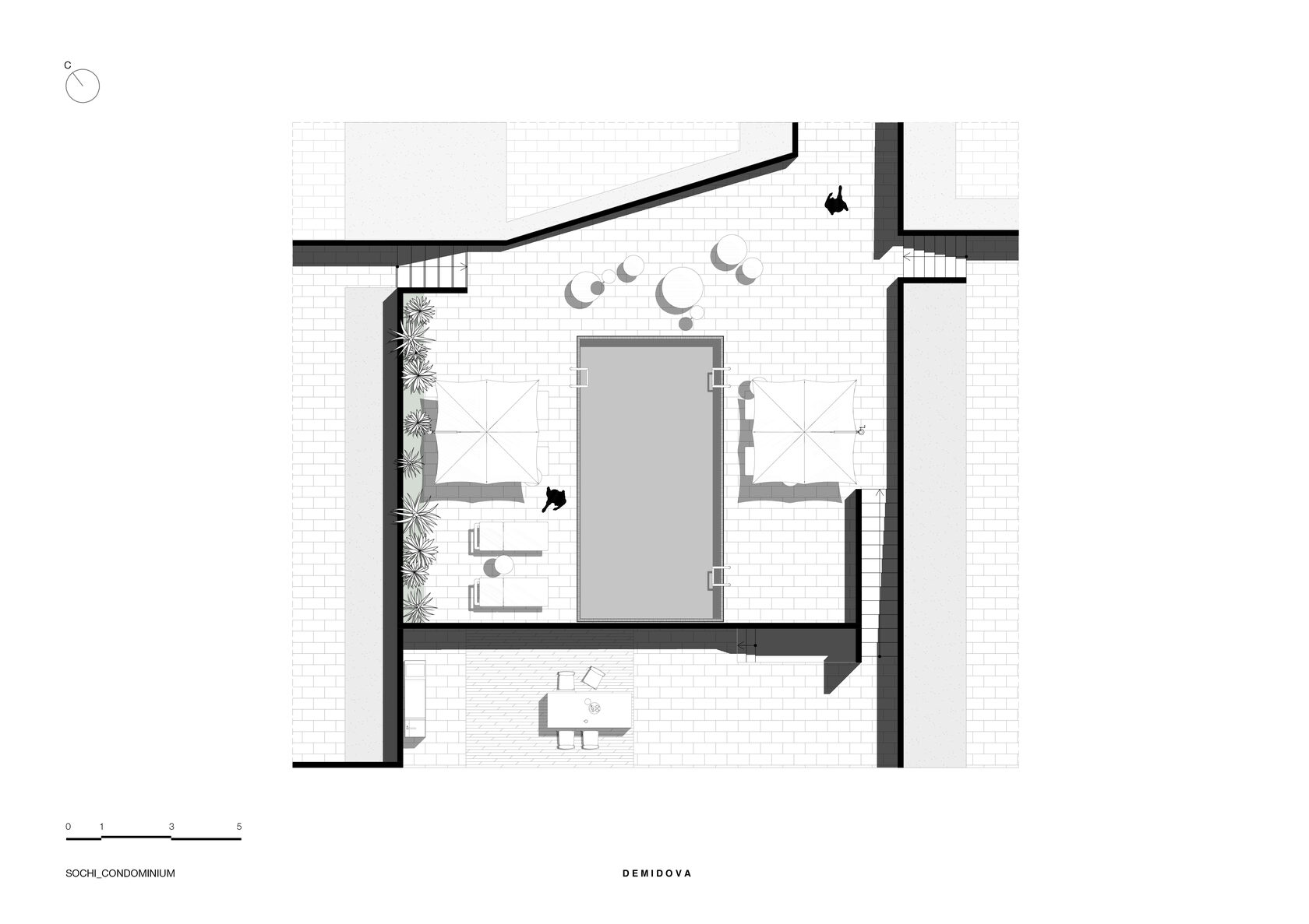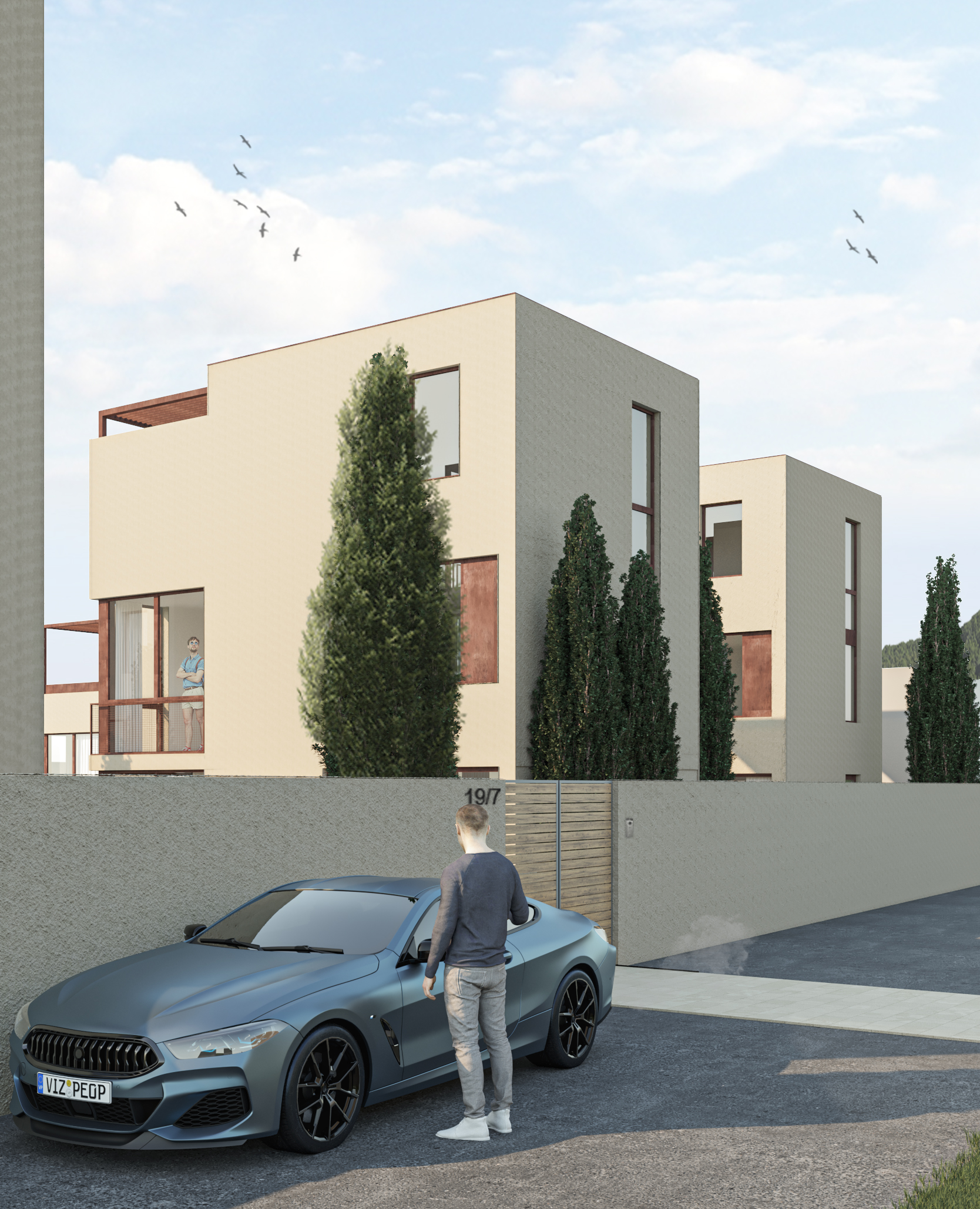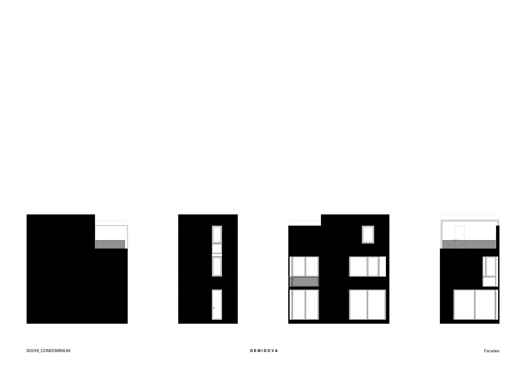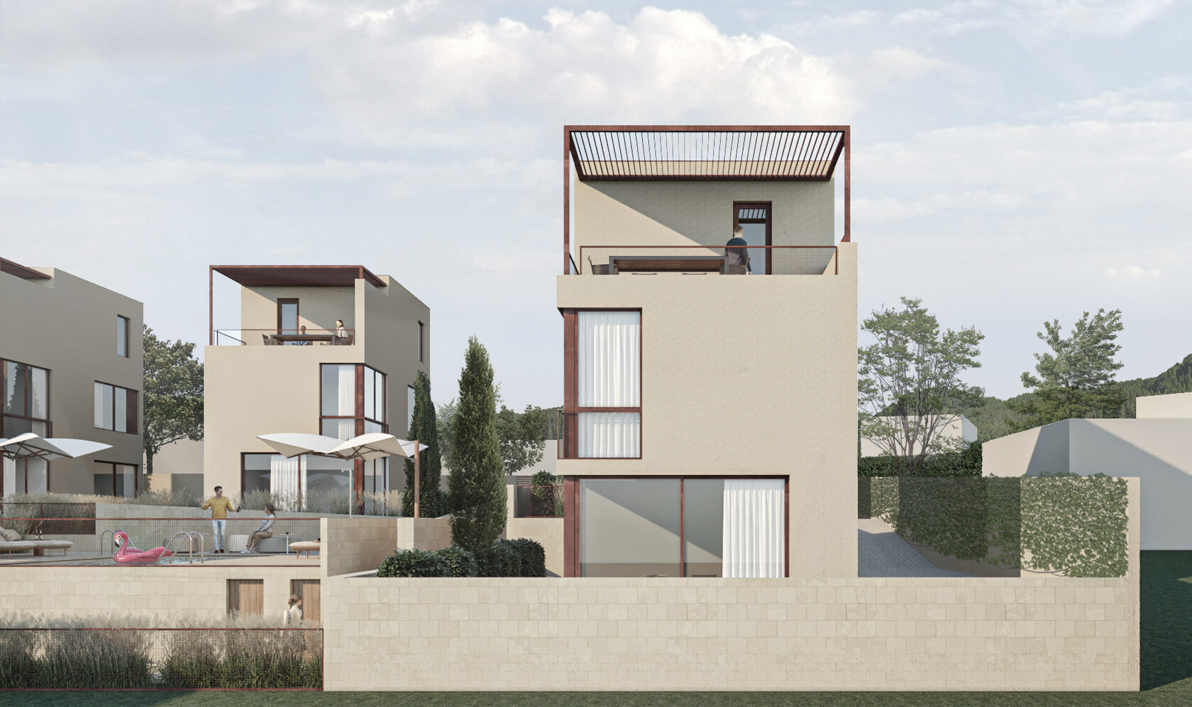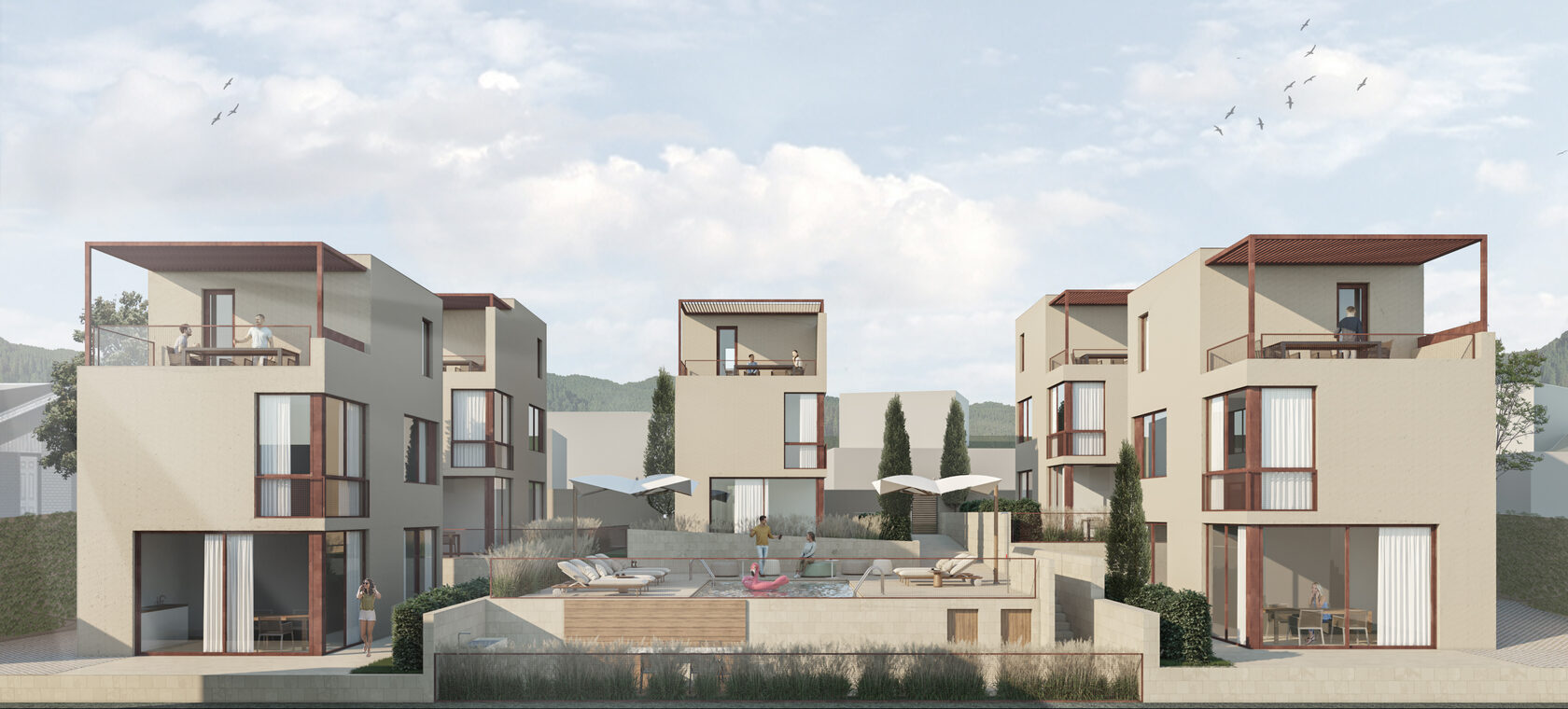 Первый этаж – гостиная, кухня-столовая и санузел, совмещенный с прачечной; на втором этаже будут расположены две спальни и ванная комната; на третьем этаже - спальня, ванная комната и открытая терраса с видом на море и общую зону.