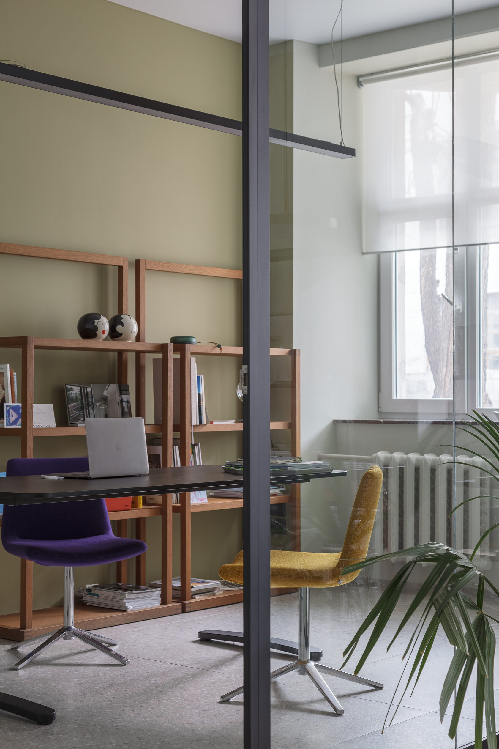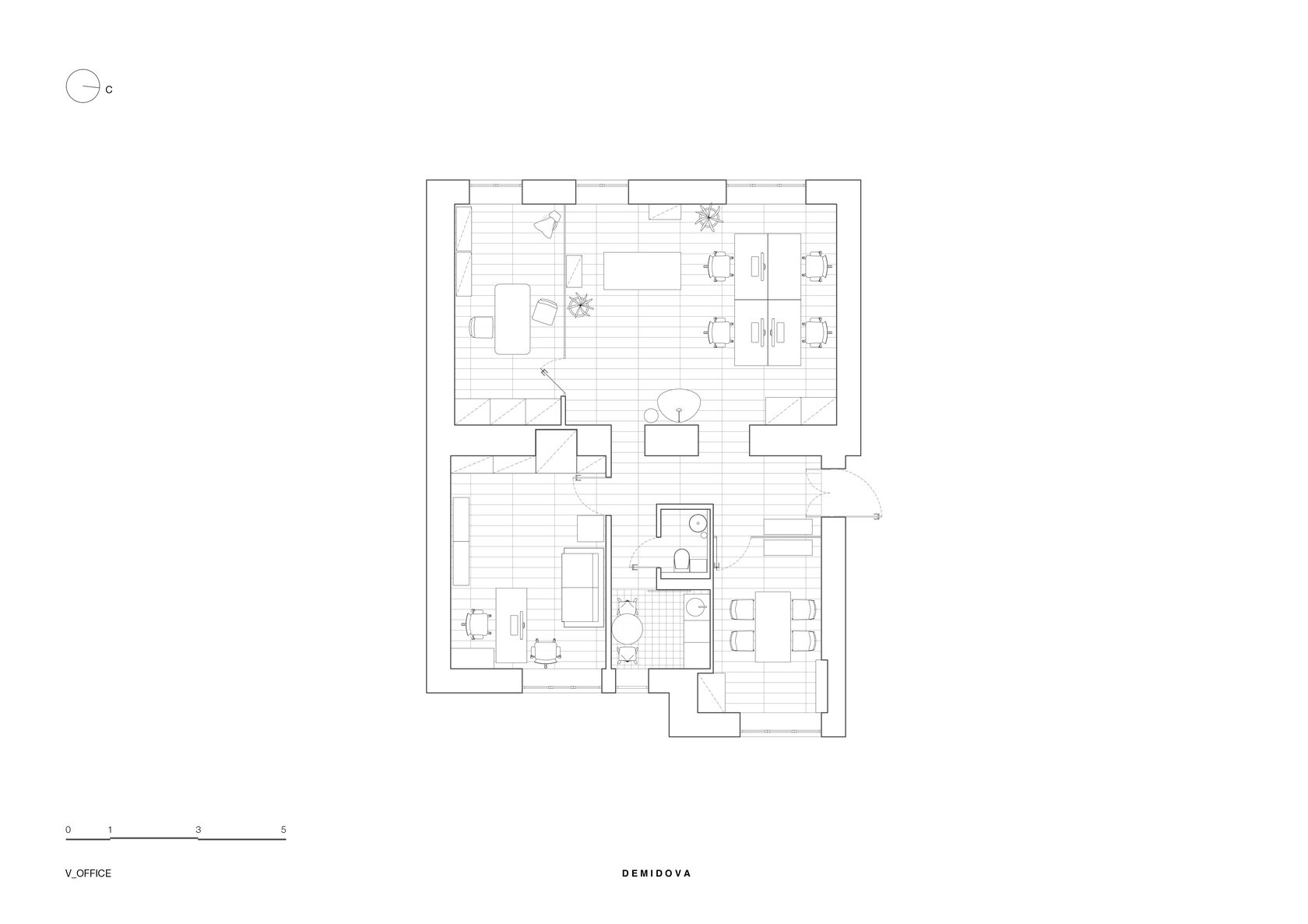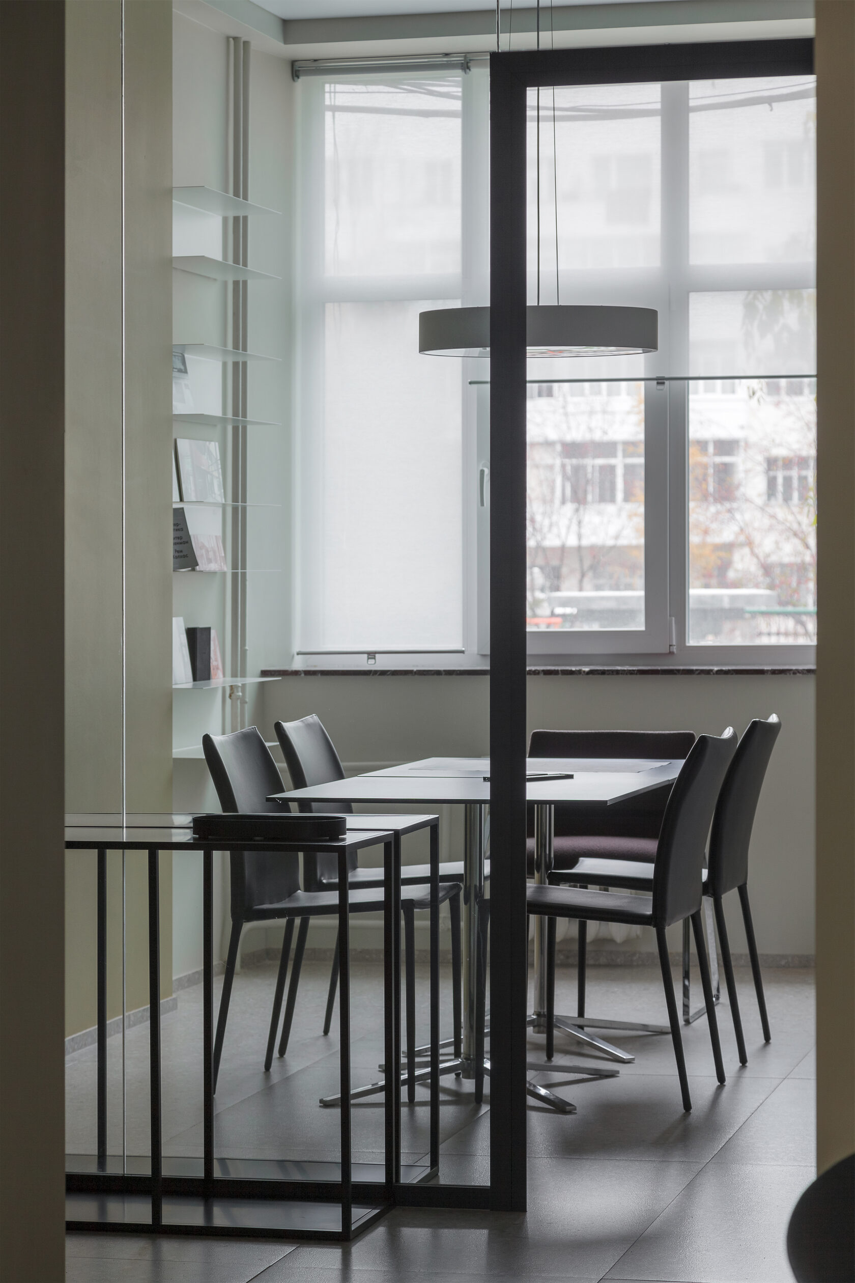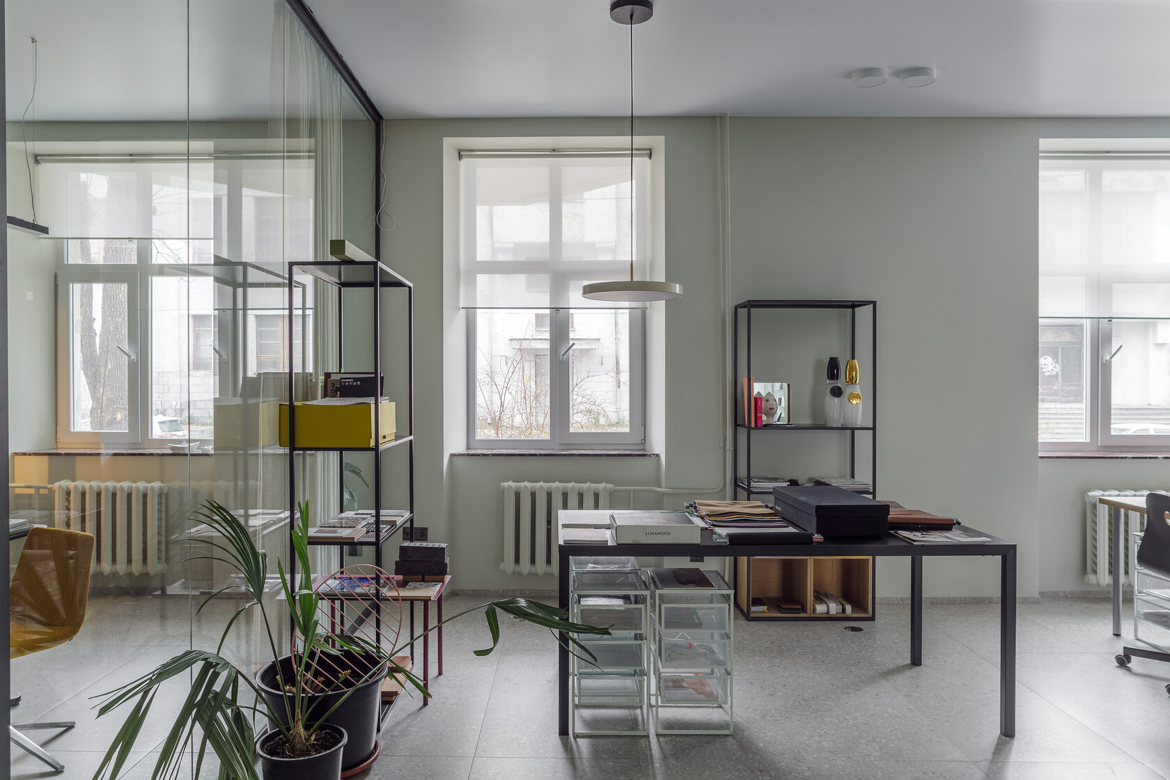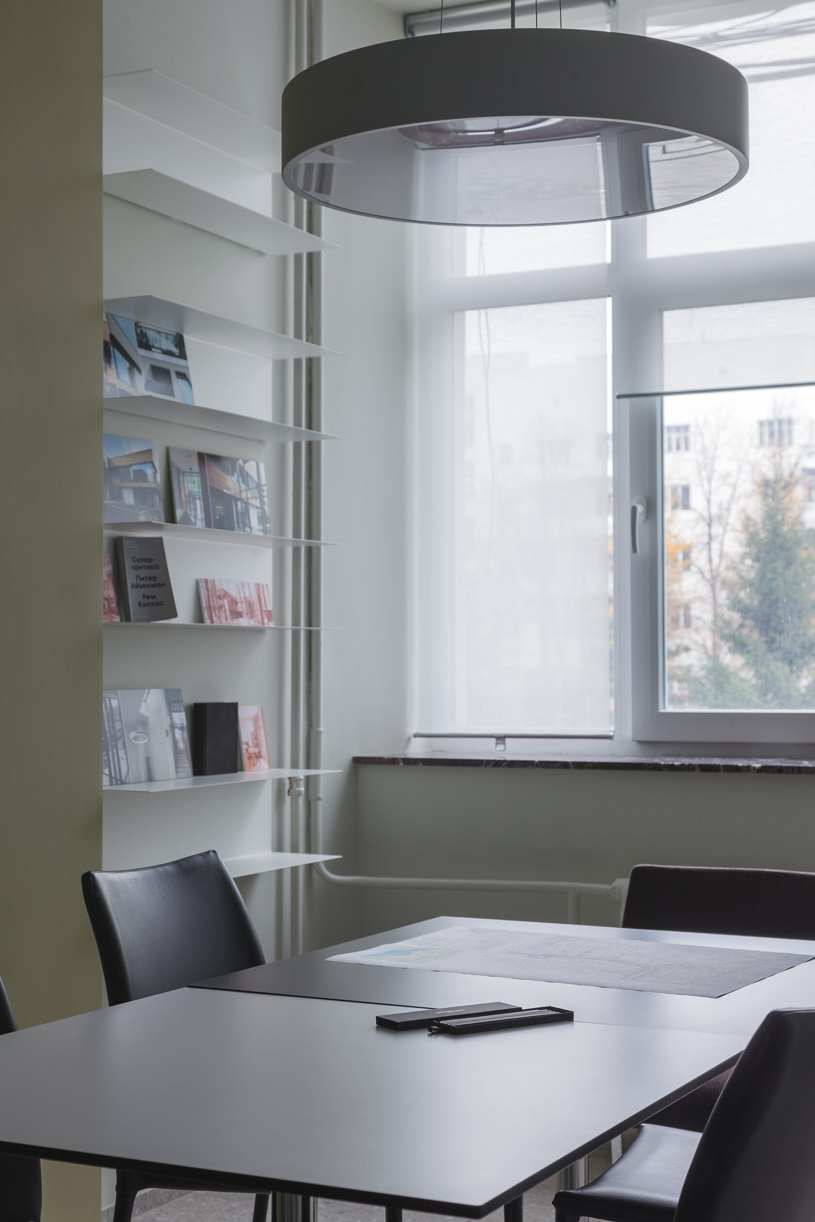 Бюро занимает помещение на первом этаже в четырехэтажном блоке Второго дома советов. Центральную часть мастерской формирует главное пространство — open space зона c экспозицией образцов материалов и обособленным рабочим местом главного архитектора бюро. По периметру устроены переговорная комната, кухня и дополнительный изолированный кабинет.