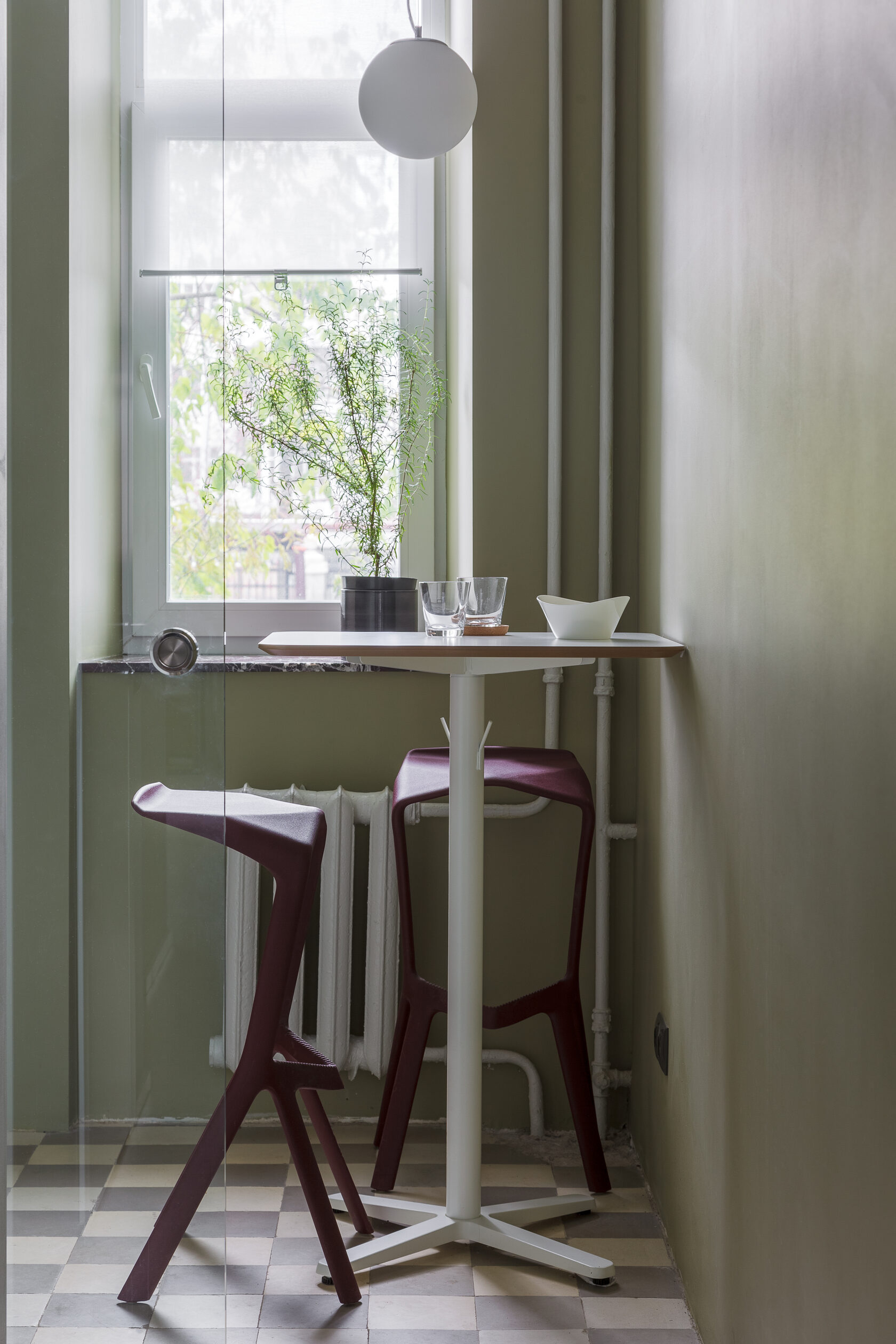 В проекте удалось выделить несколько оригинальных элементов 30-х годов, сохранившихся после предыдущих владельцев помещения: тяжёлые деревянные распашные входные двери, чугунные радиаторы и оригинальную напольную плитку в пространстве, которое после реконструкции занимает кухня. Оригинальные элементы дополнены современной мебелью, сложным цветом стен, текстурой напольного покрытия, стеклом и подоконниками из натурального камня.