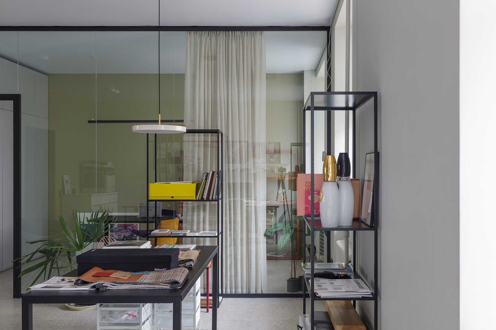 Чтобы открыть пространство, помещения разграничили стеклянными перегородками, быт перенесли в скрытые системы хранения. Сдержанный функциональный интерьер дополнен книгами, рабочими материалами, фотографиями реализованных объектов, предметами искусства и коллекционного дизайна.
